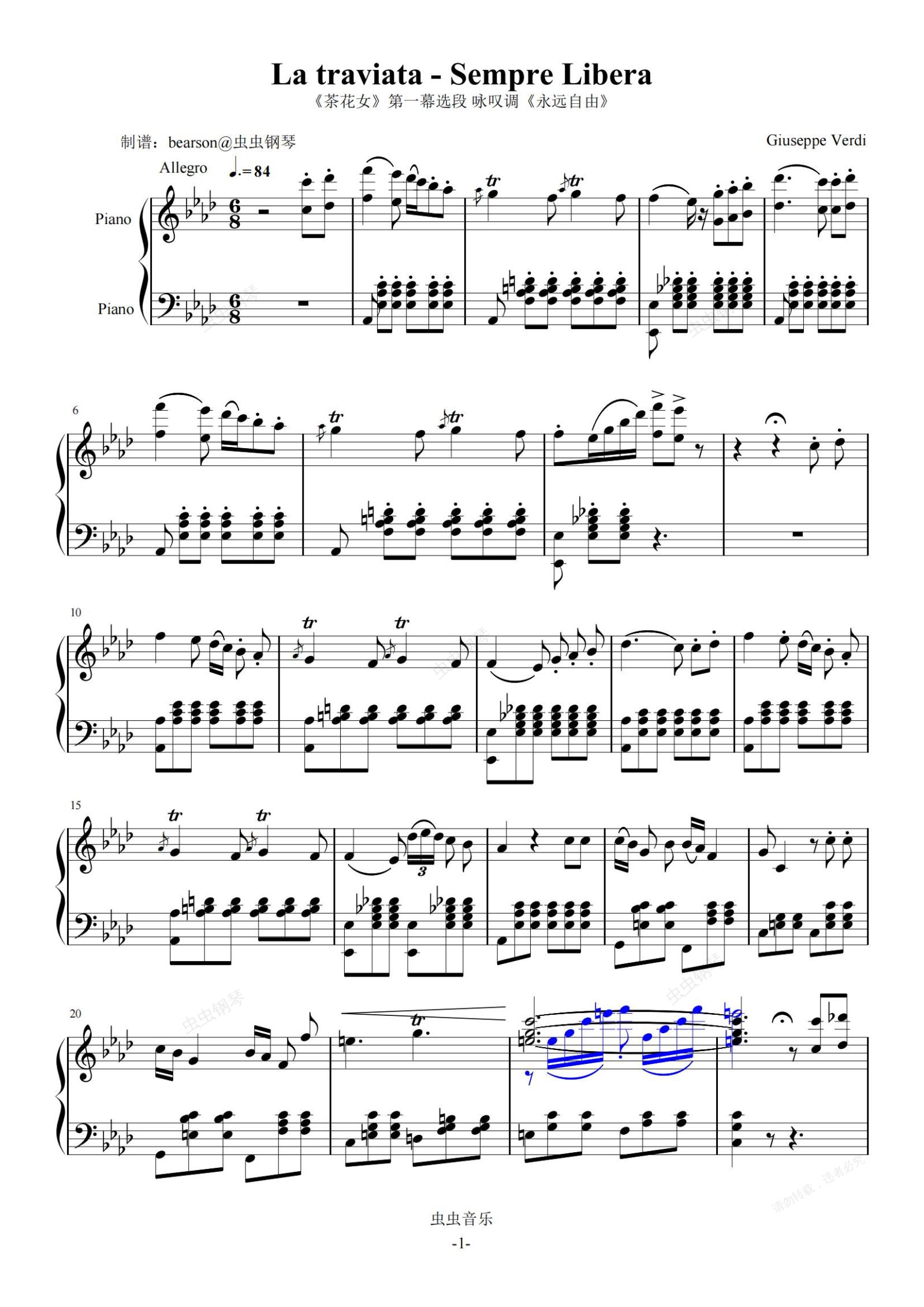 钢琴谱:威尔第歌剧《茶花女》选段《永远自由》(Sempre Libera)