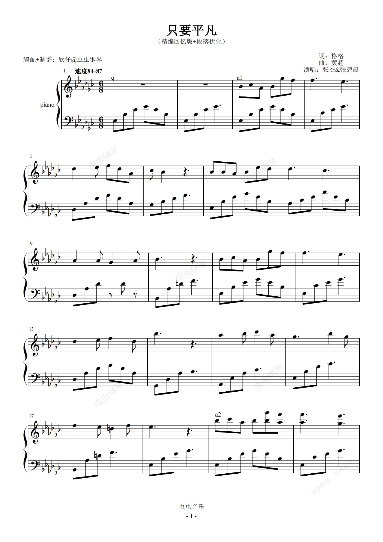 钢琴谱:张杰&张碧晨-降e《只要平凡》(精编回忆版+段落优化)