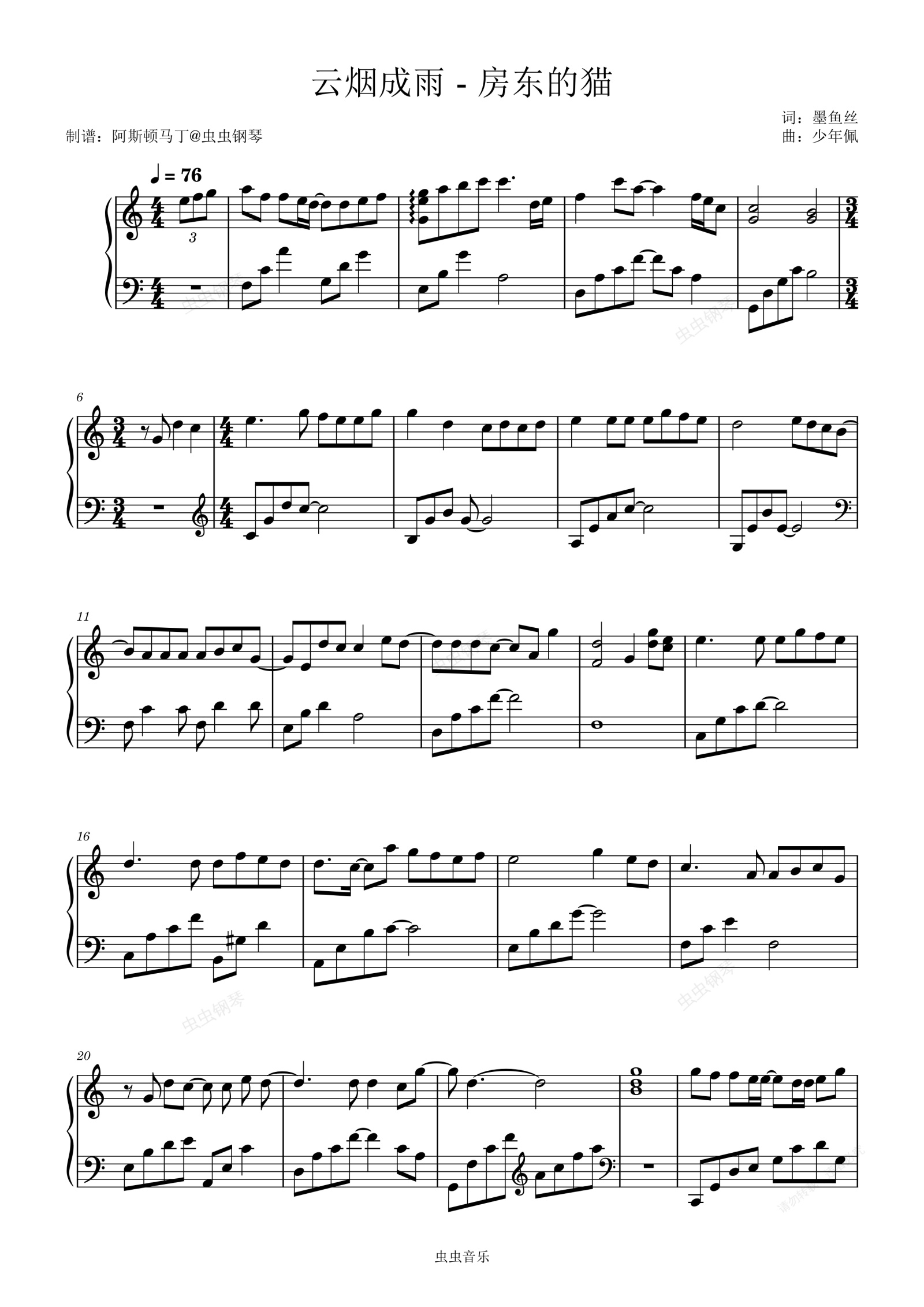钢琴谱:云烟成雨(C调) - 房东的猫 独奏