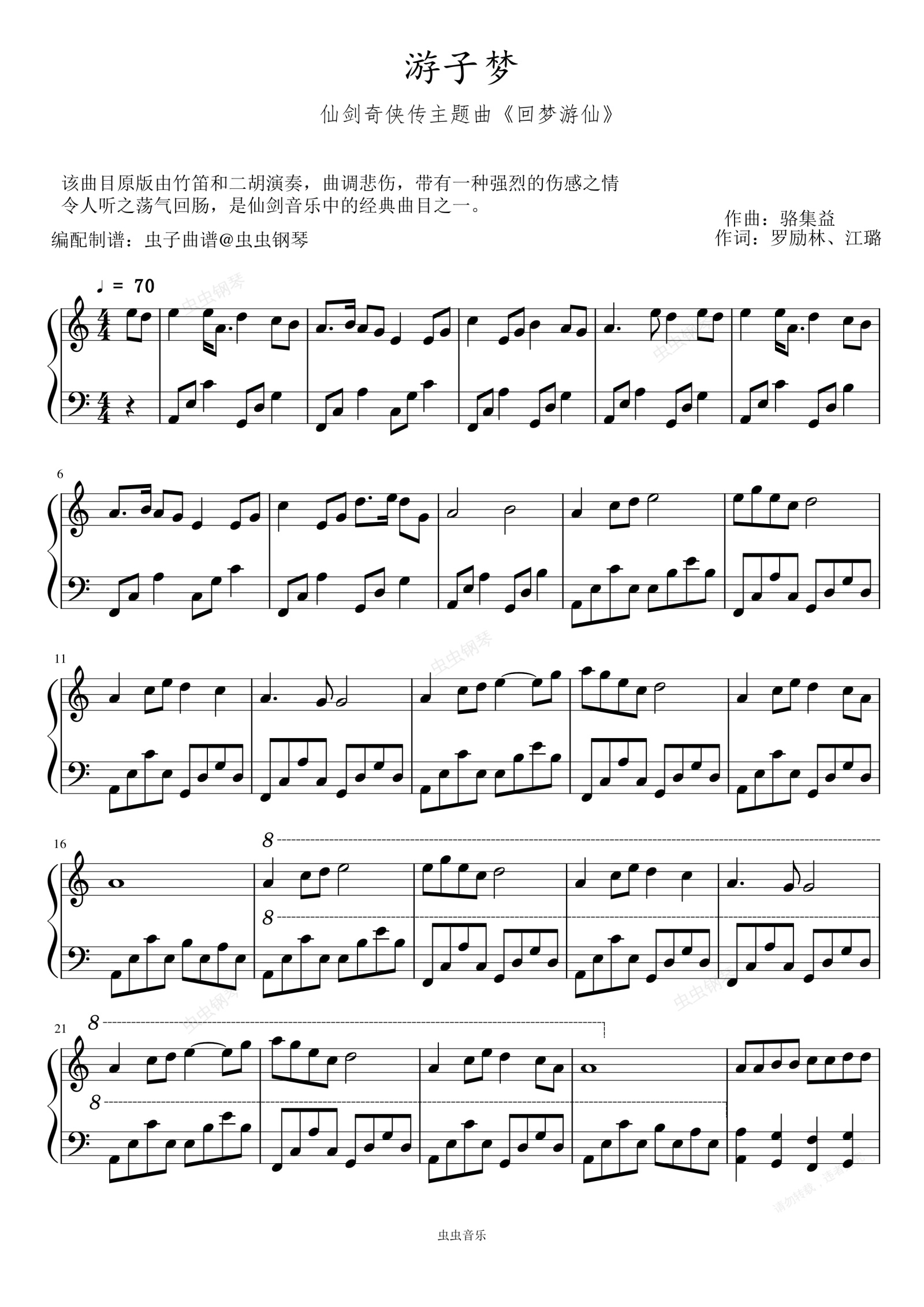 钢琴谱:游子梦_C大调 (仙剑奇侠传主题曲《回梦游仙》) 选调编配