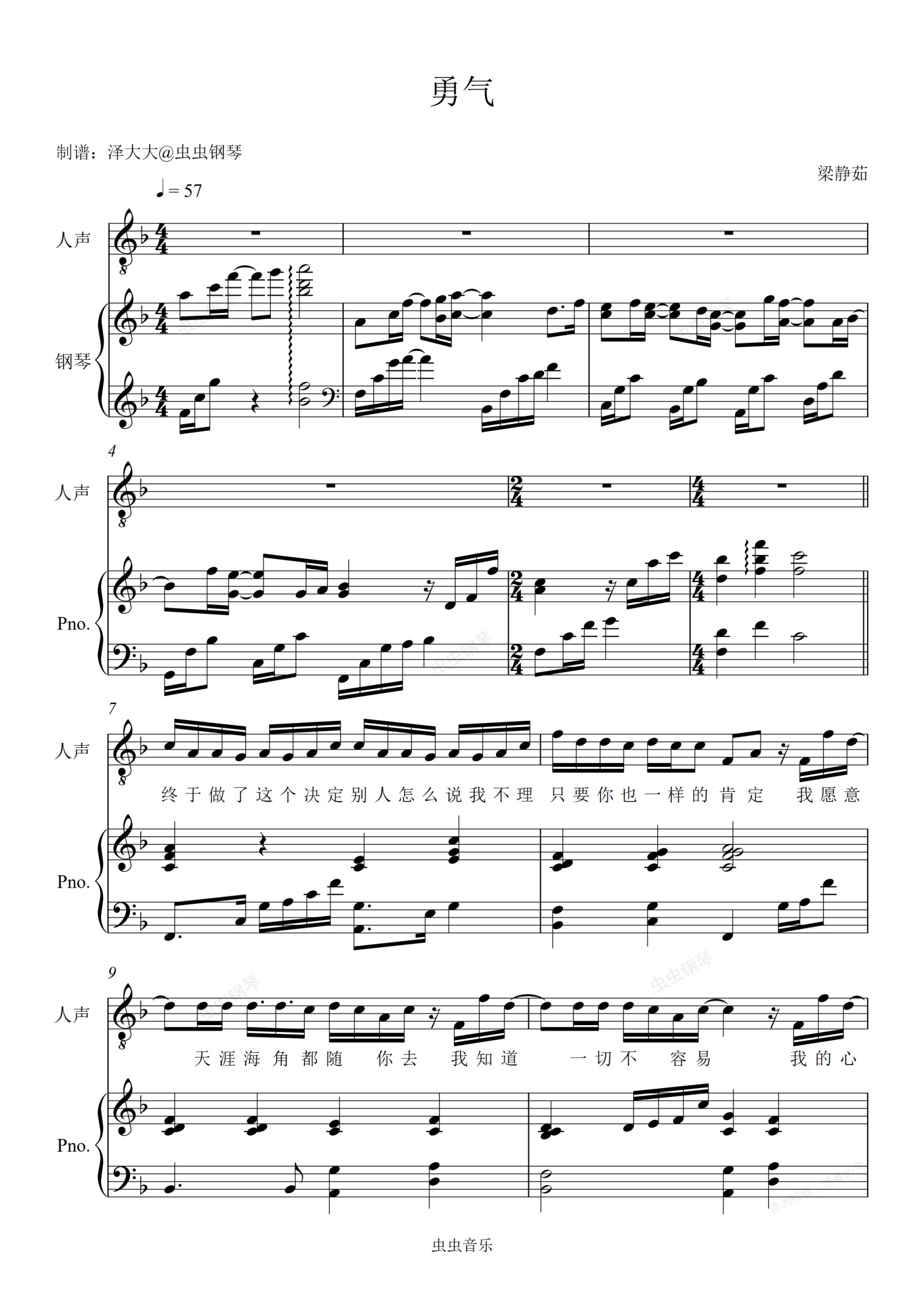 钢琴谱:勇气【精编原版弹唱附词】泽大大 梁静茹