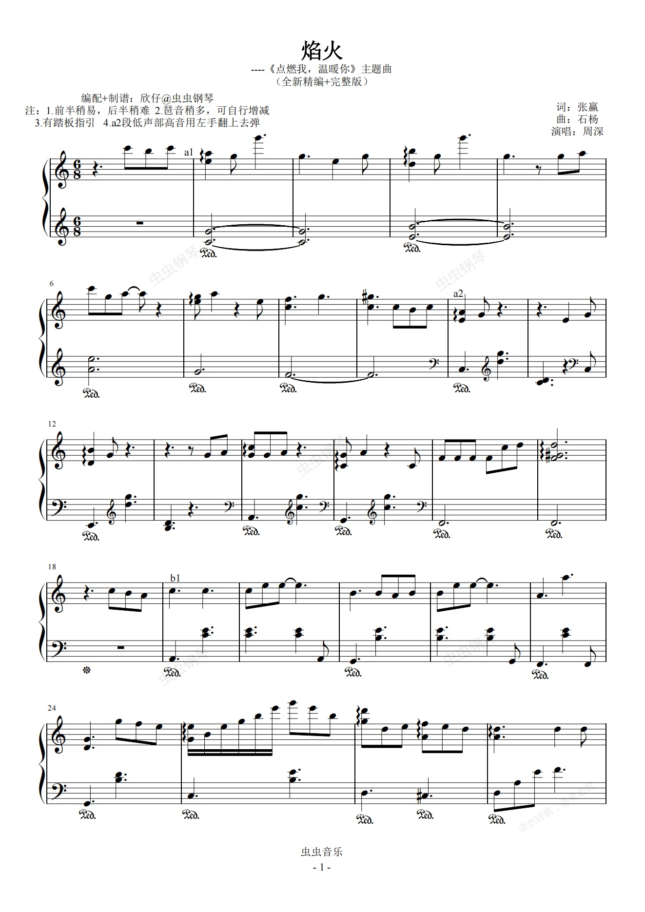 钢琴谱:周深-C《焰火》(《点燃我,温暖你》主题曲、完整版)