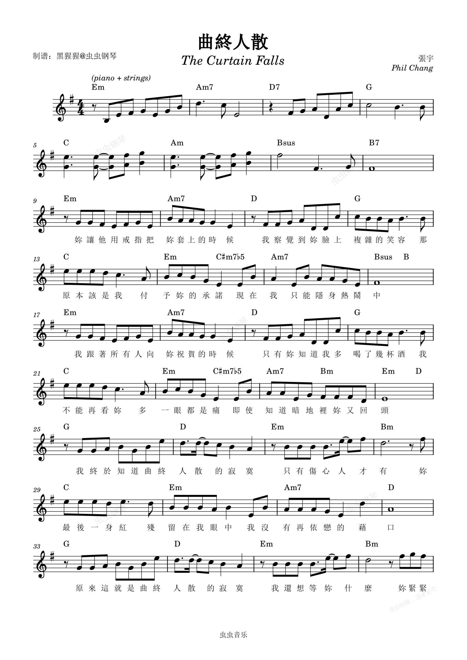 钢琴谱:张宇-G调 《曲终人散》【带歌词】