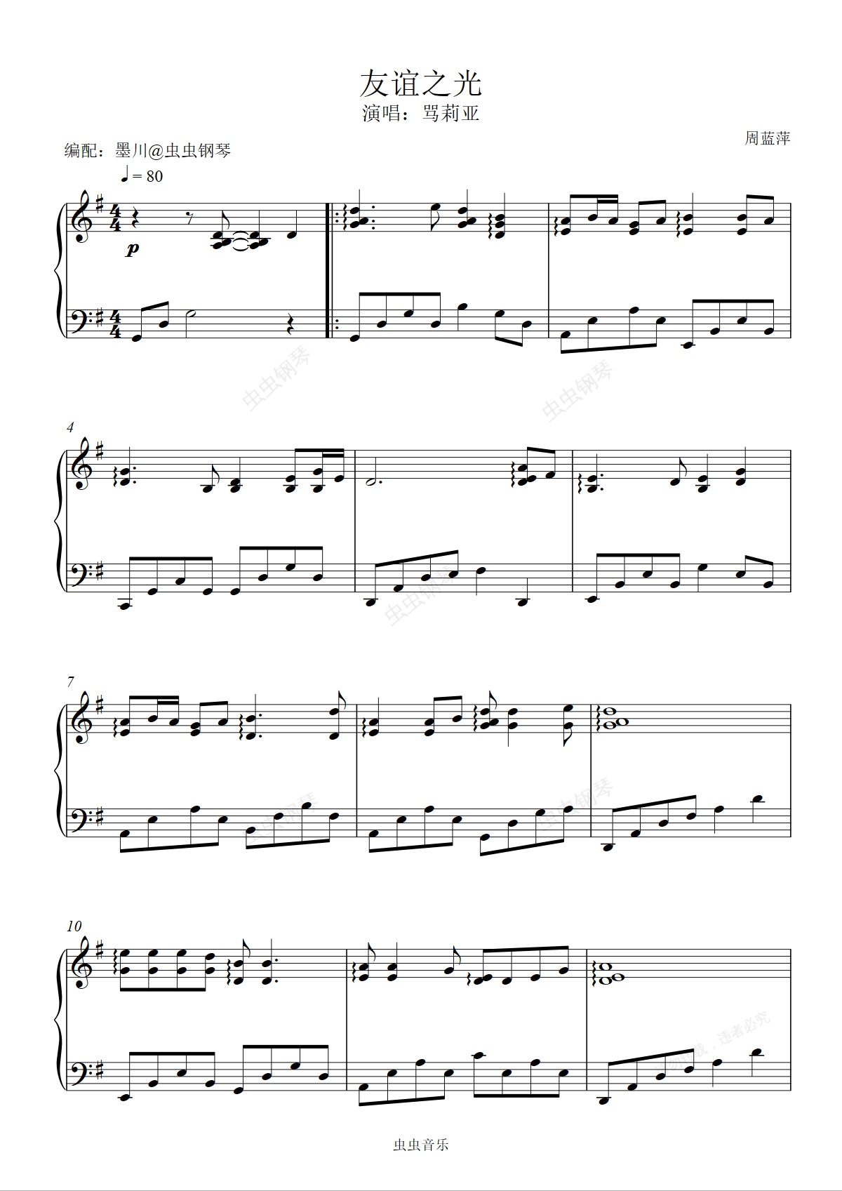 钢琴谱:友谊之光—玛莉亚—G调编配