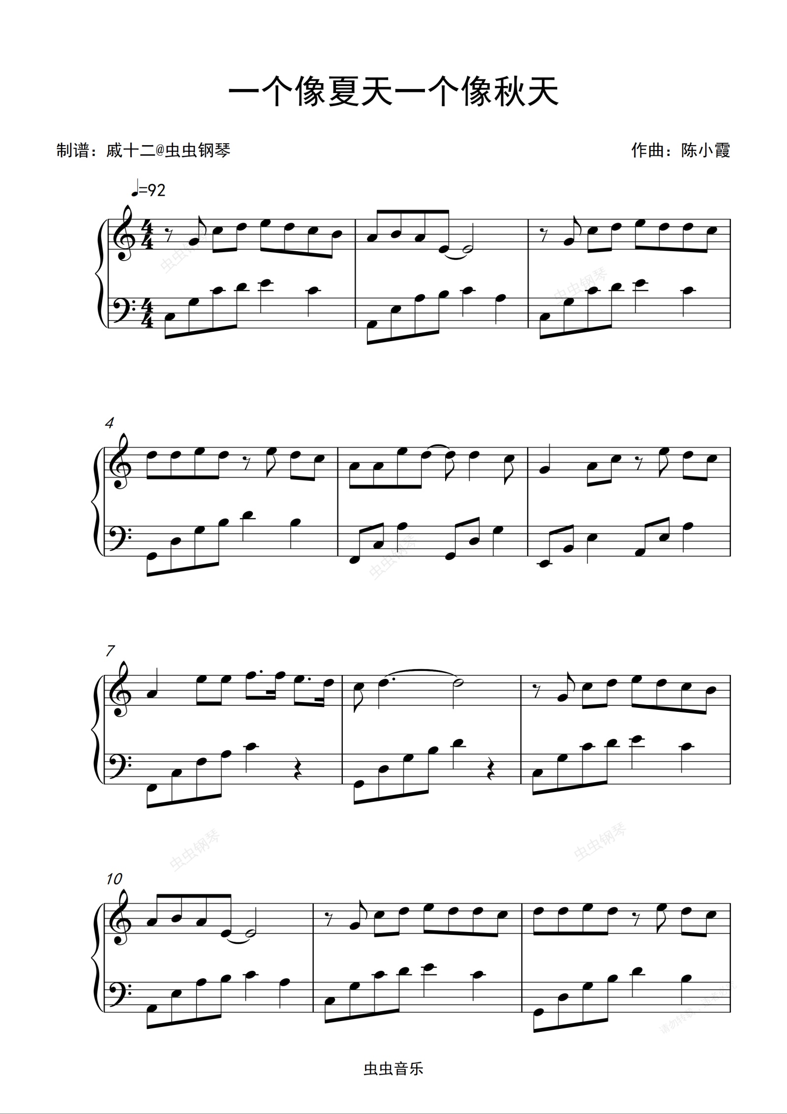 钢琴谱:一个像夏天一个像秋天-C调简单版