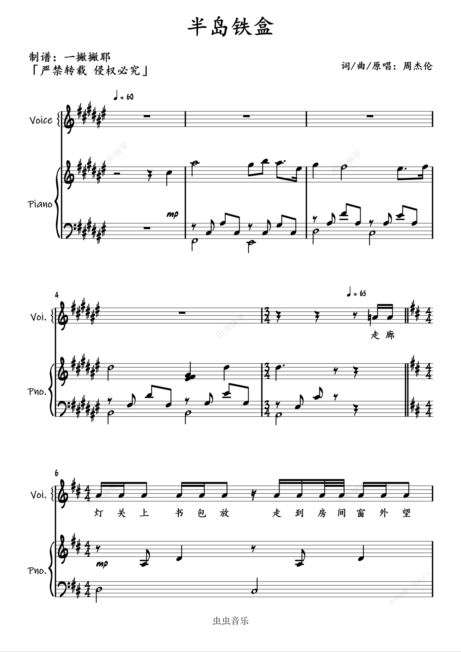 钢琴谱:升调女版弹唱《半岛铁盒》周杰伦「一撇撇耶」