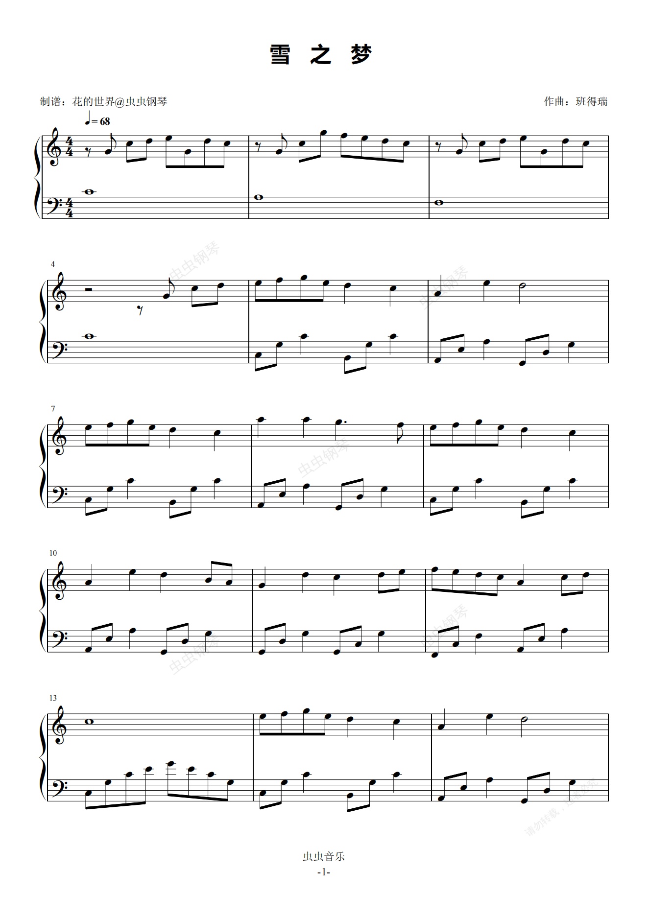钢琴谱:雪之梦 C调简易版 班得瑞 经典