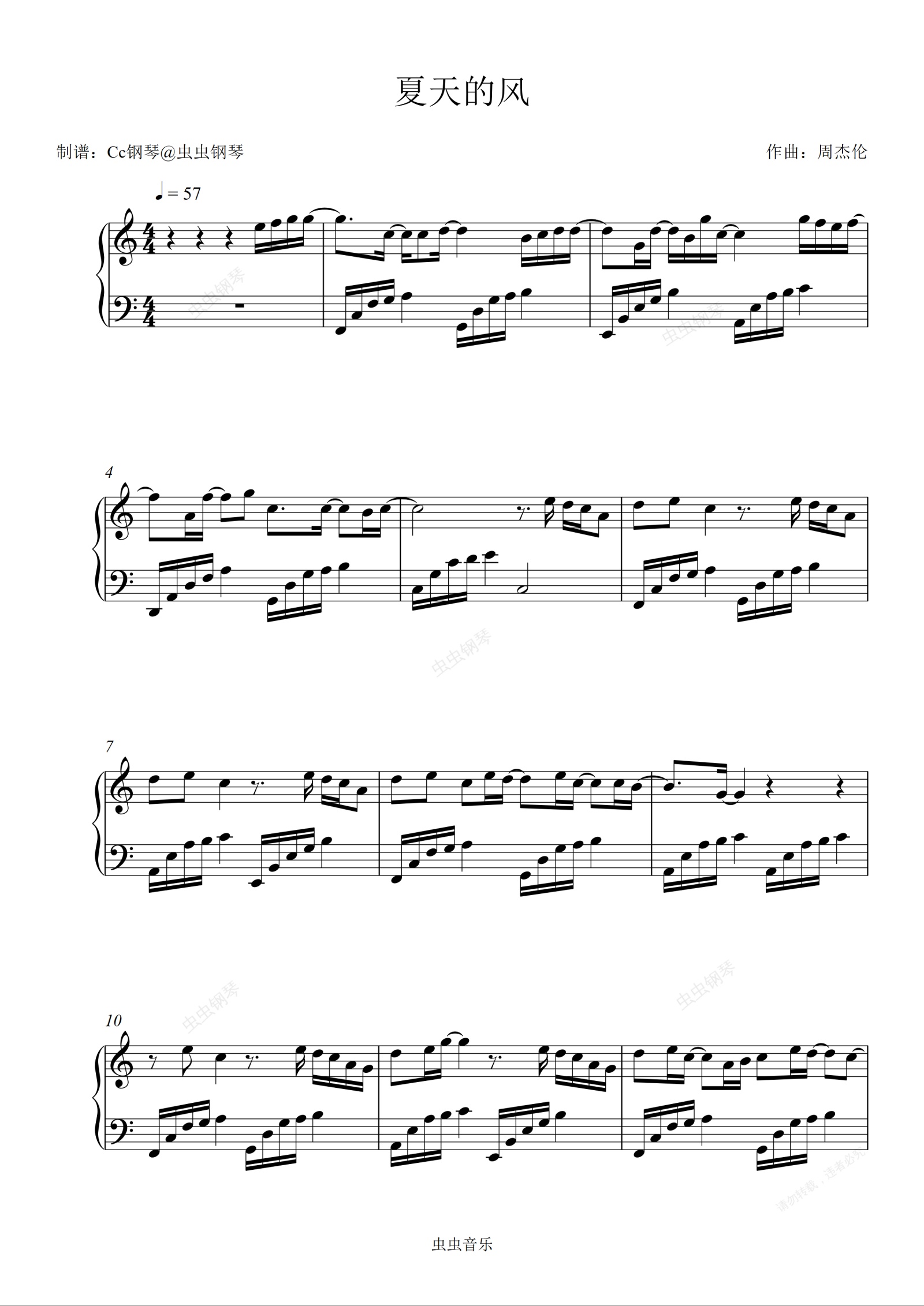 钢琴谱:夏天的风 C调 好听易上手
