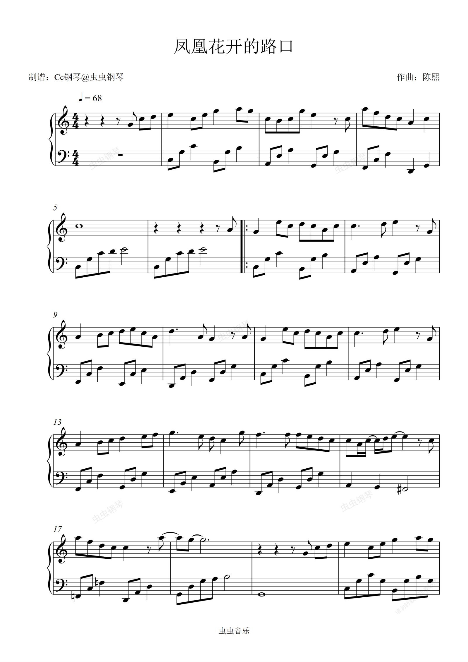 钢琴谱:凤凰花开的路口 C调 好听易上手
