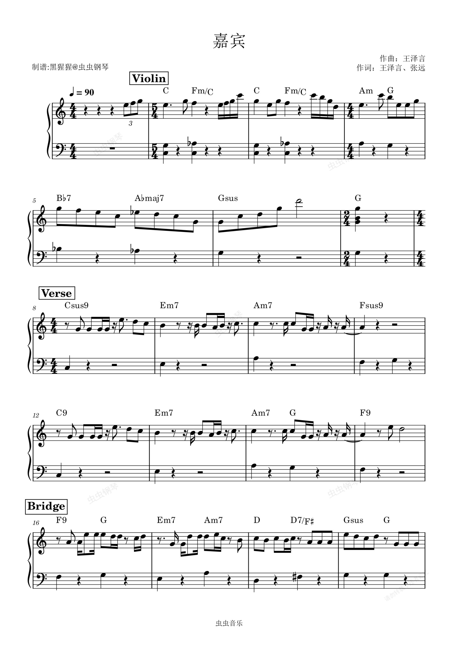 钢琴谱:张远-C调 《嘉宾》