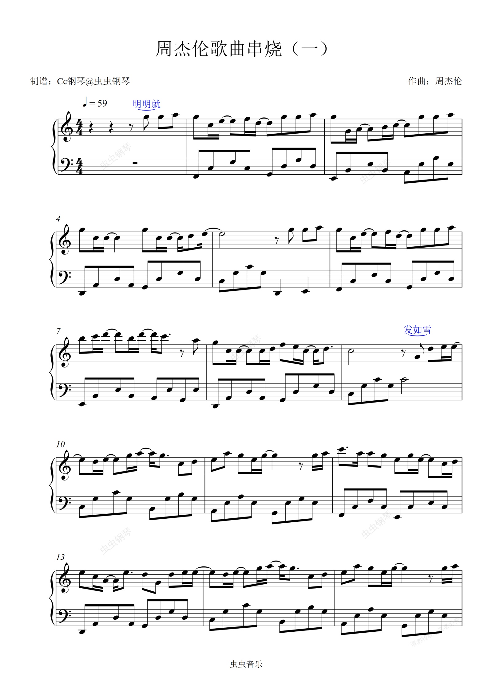 钢琴谱:周杰伦 歌曲串烧(一)C调 好听易上手