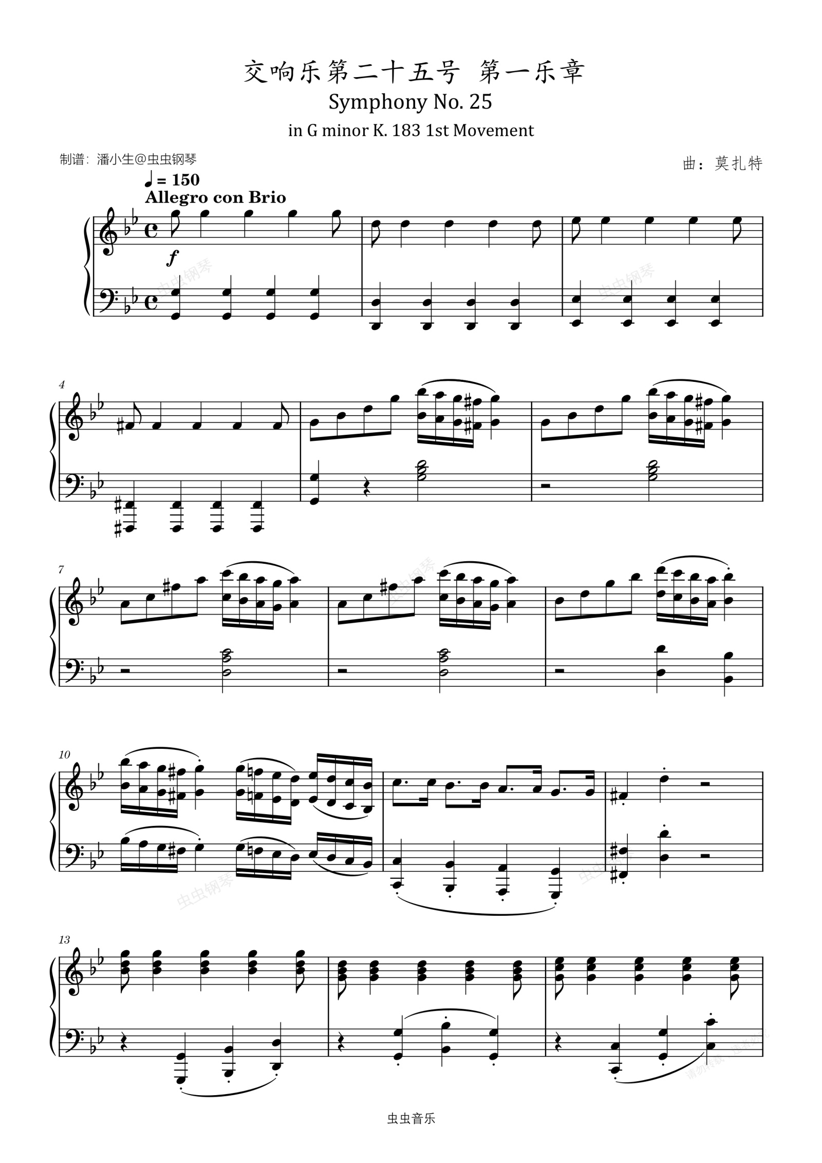 钢琴谱:莫扎特 交响乐第二十五号  Symphony No.25 第一乐章 in G minor K. 183 钢琴独奏