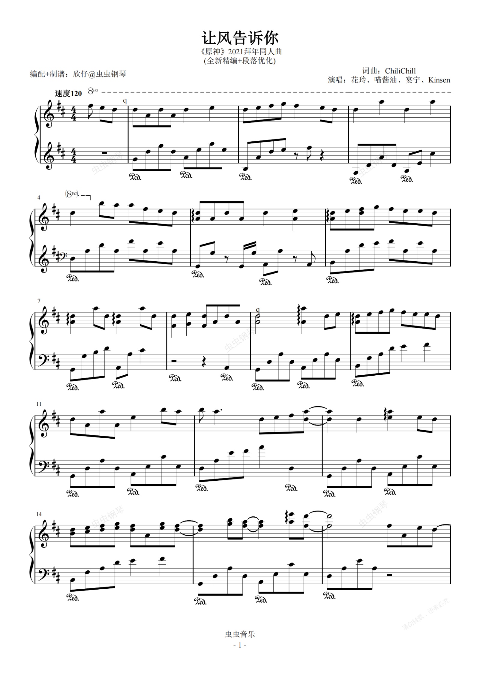 钢琴谱:D-《让风告诉你》(《原神》2021拜年同人曲、全新精编+段落优化)