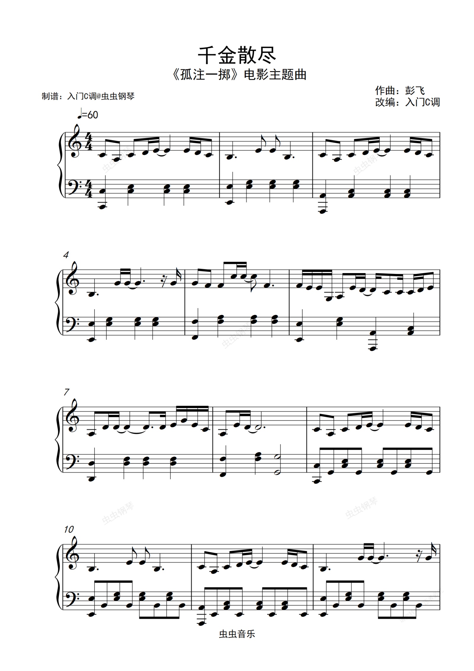 钢琴谱:杨宗纬《千金散尽》(《孤注一掷》电影主题曲)入门C调简单版