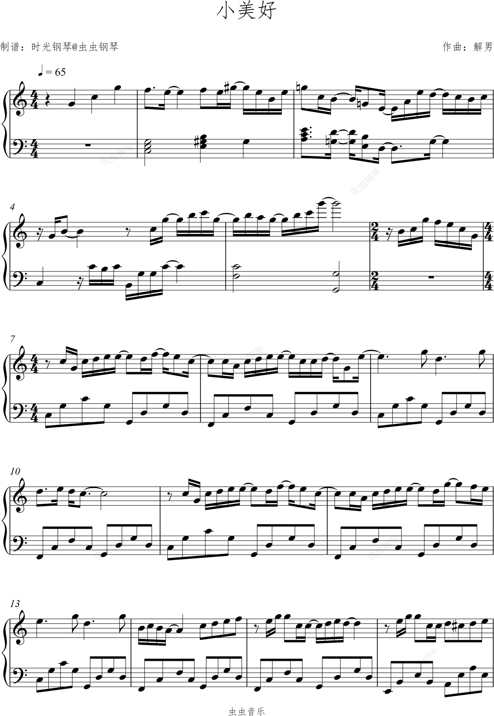 钢琴谱:小美好 C调简易 冯佳琪