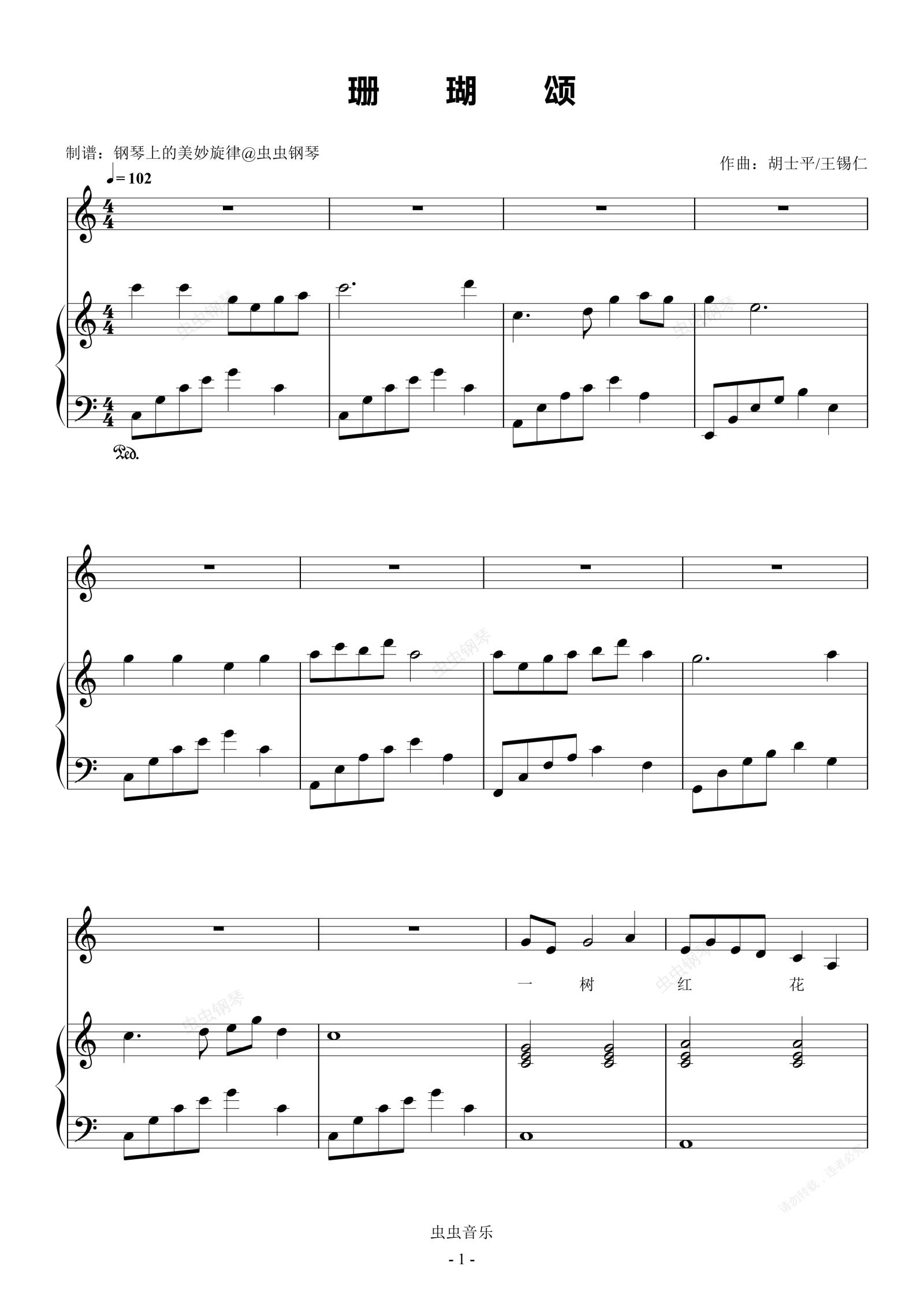 钢琴谱:珊瑚颂 C调简易钢琴弹唱伴奏 带歌词 经典流行