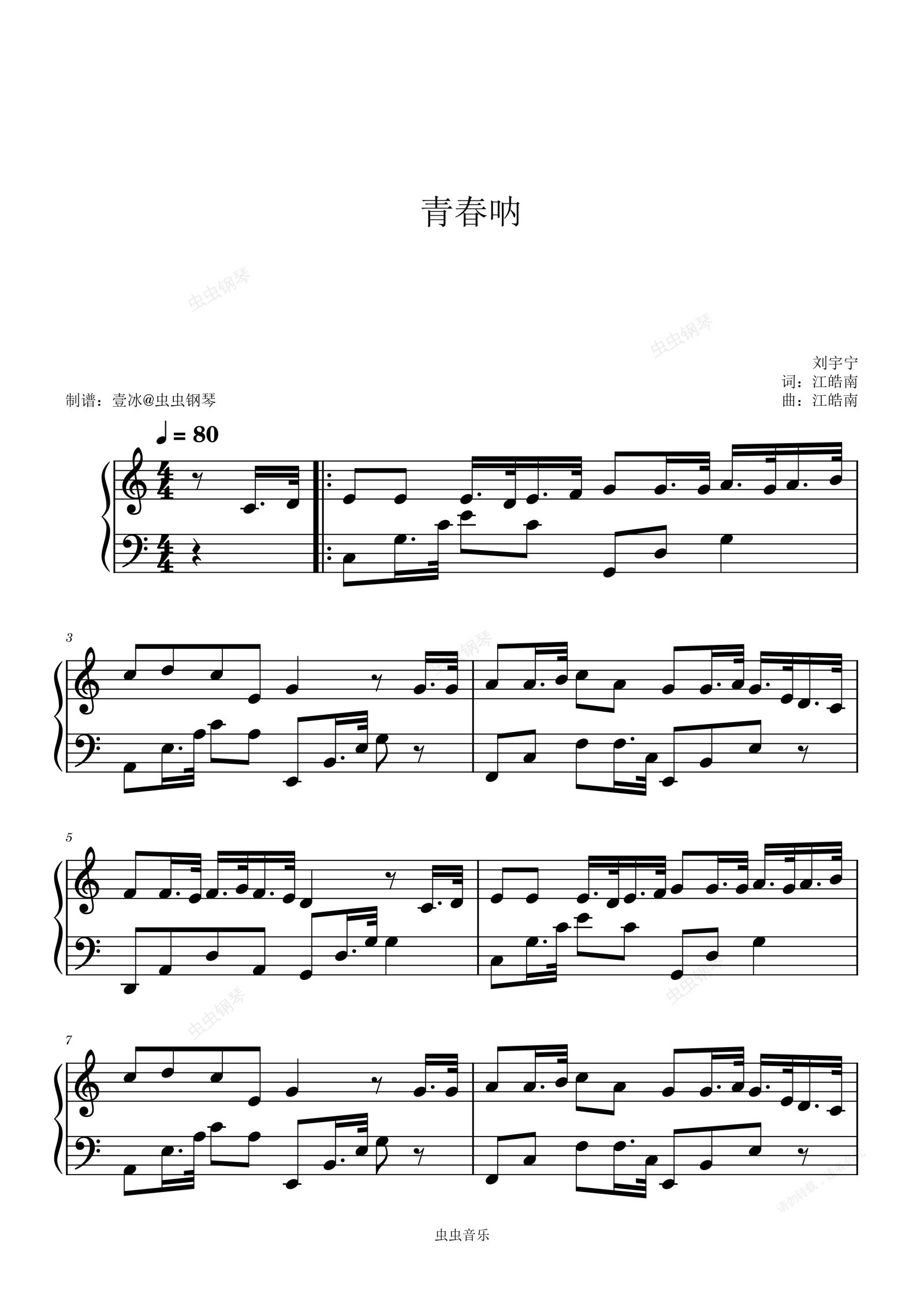 钢琴谱:青春呐 - 刘宇宁 C调