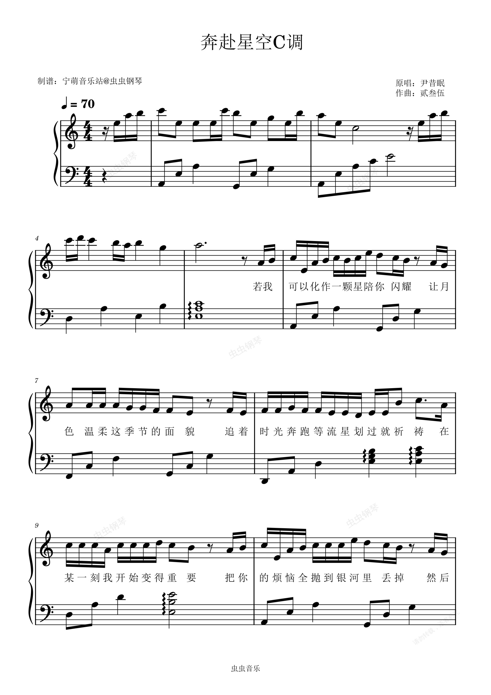 钢琴谱:奔赴星空C调带歌词初学者钢琴谱 尹昔眠