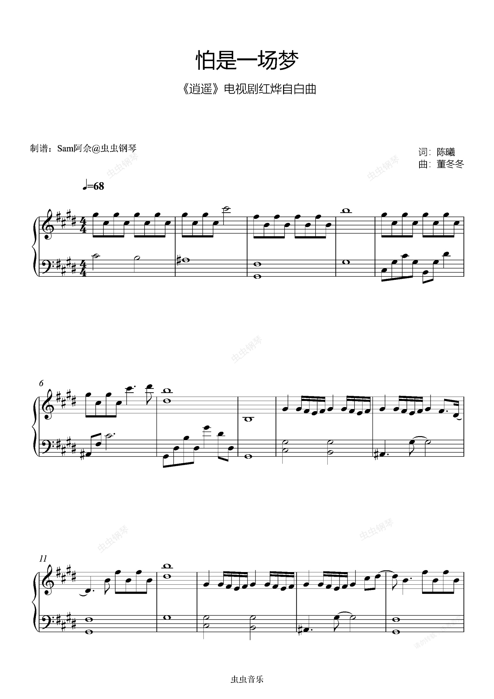钢琴谱:原调《怕是一场梦》侯明昊