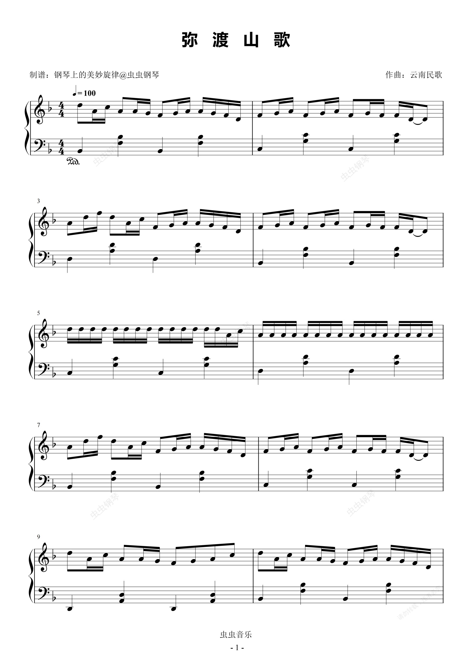 钢琴谱:弥渡山歌 简易版 云南民歌