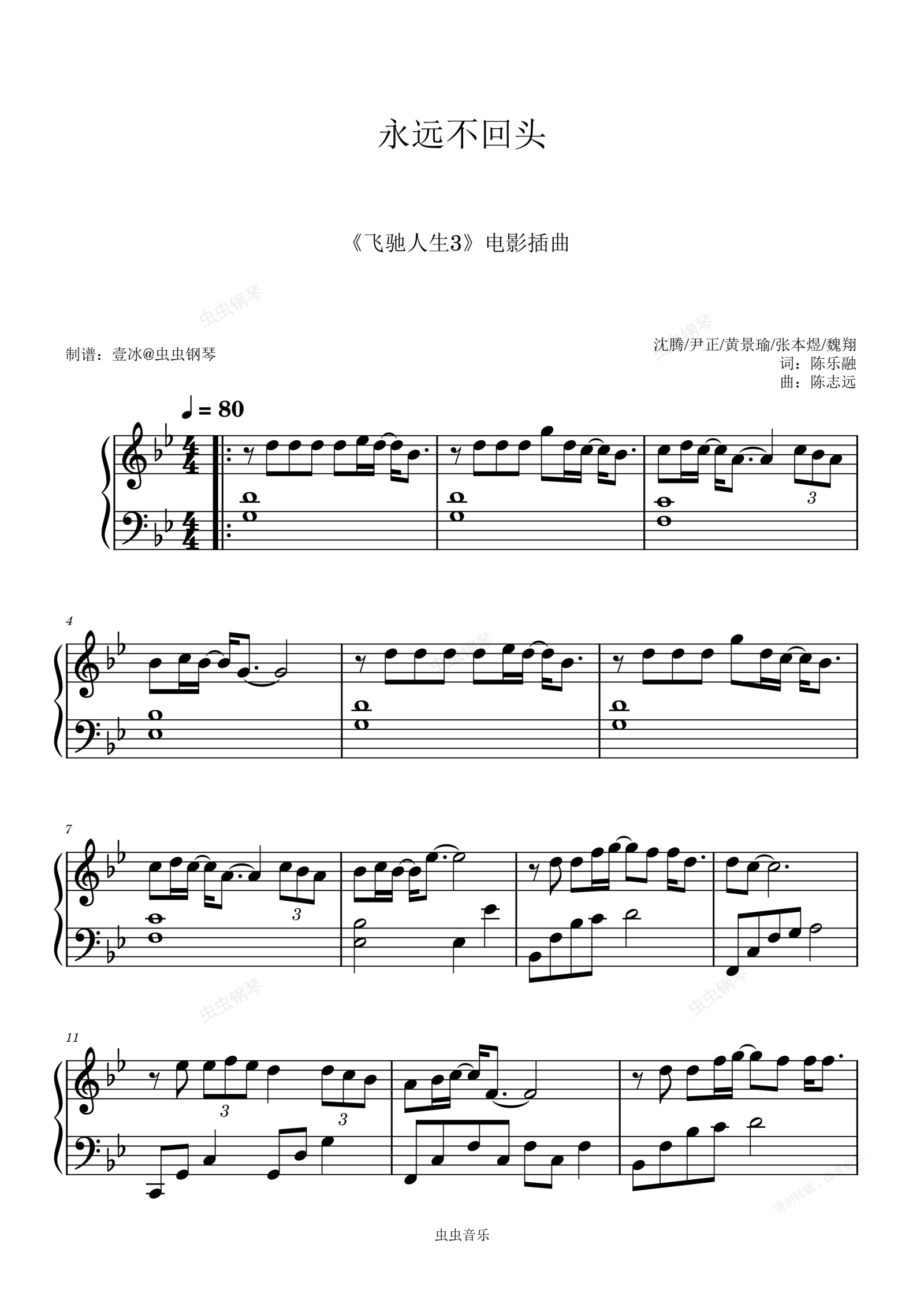 钢琴谱:永远不回头 (《飞驰人生3》电影插曲) - 原调