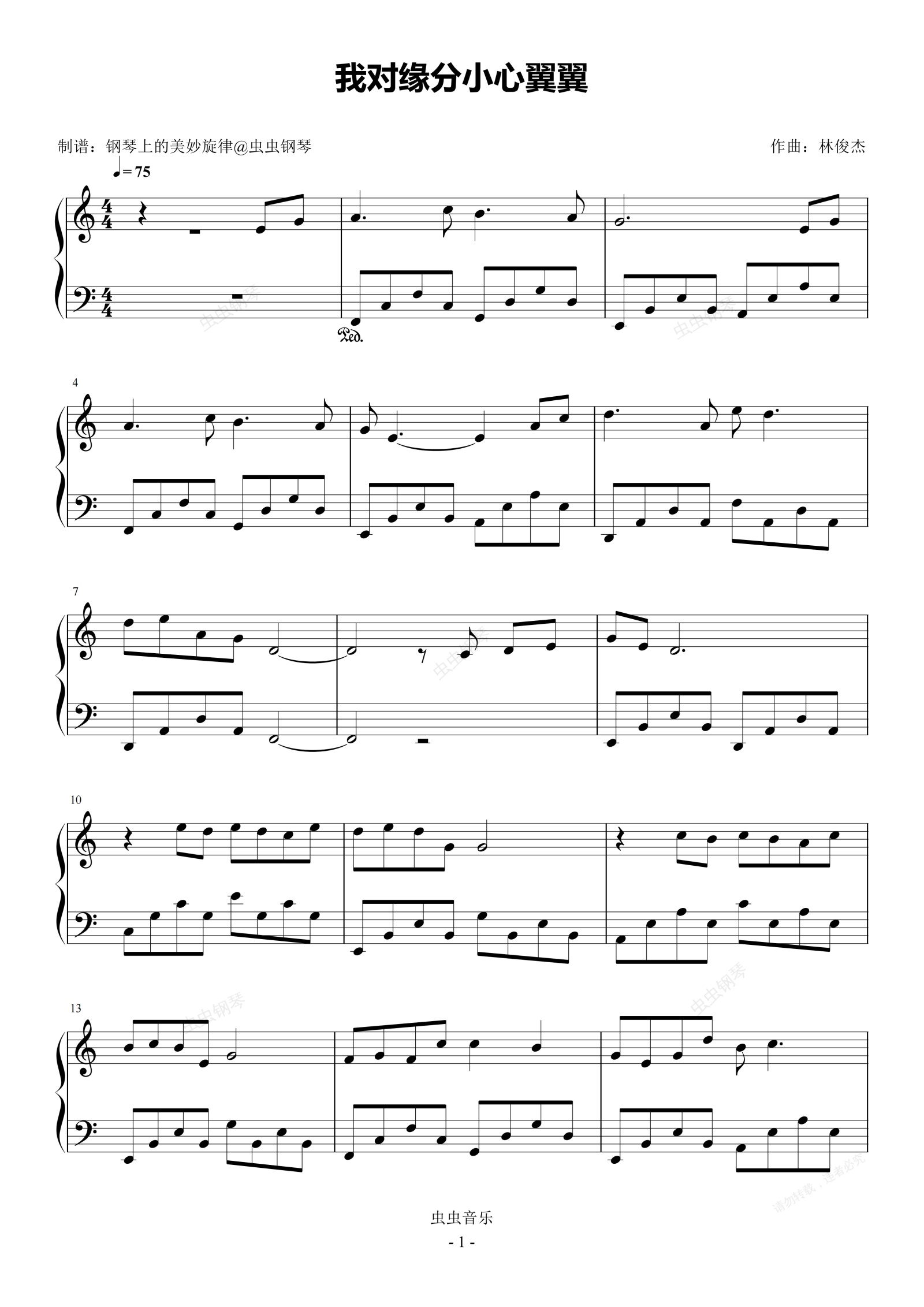 钢琴谱:我对缘分小心翼翼 C调简易版 林俊杰 逐玉 主题曲