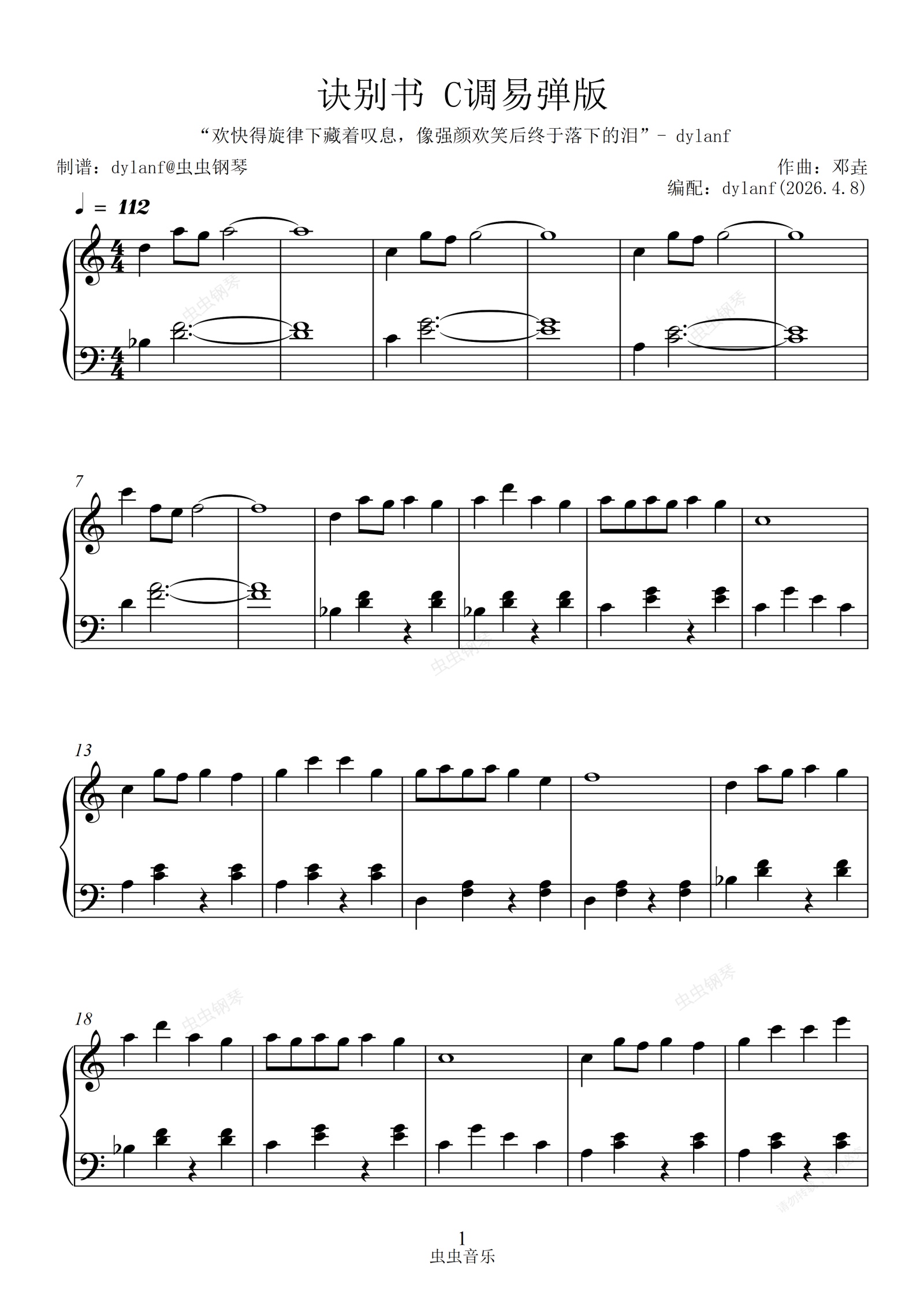钢琴谱:诀别书 C调简易好弹 高还原版 dylanf 邓垚