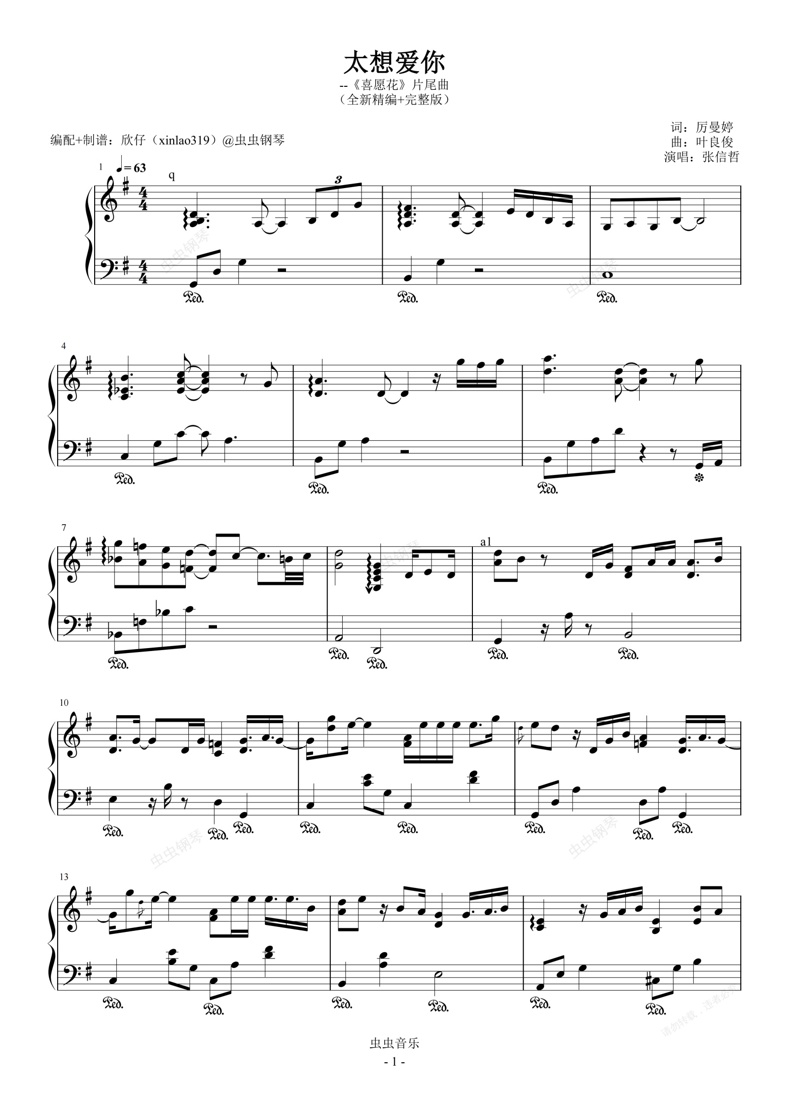 钢琴谱:太想爱你(G、张信哲、完整版)