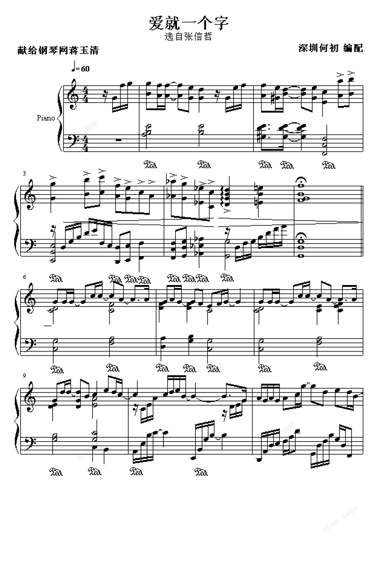爱就一个字 - 张信哲 张信哲-爱就一个字 C F G C 拨开天空的乌云 像蓝丝绒一样美丽 C F G C 我为你翻山越岭 却无心看风景 C Em F G 我想你身不由己 每个念头有新的梦境 Em Am F F G F 但愿你没忘记 我永远保护你 不管风雨的打击全心全意 C F G C 两个人相互辉映 光芒胜过夜晚繁星 C F G C 我为你翻山越岭 却无心看风景 C Em F G 我想你鼓足勇气 凭爱的地图散播讯息 Em Am F F G 但愿你没忘记 我永远保护你 从此不必再流浪找寻 C G Am G 爱就一个字 我只说一次 你知道我只会用行动表示 F C F G 承诺一辈子 守住了坚持 付出永远不会太迟 C G Am G 爱就一个字 我只说一次 恐怕听见的人勾起了相思 F C F G 任时光飞逝 搜索你的影子 让你幸福我愿意试 F G C 让你幸福是我一生在乎的事