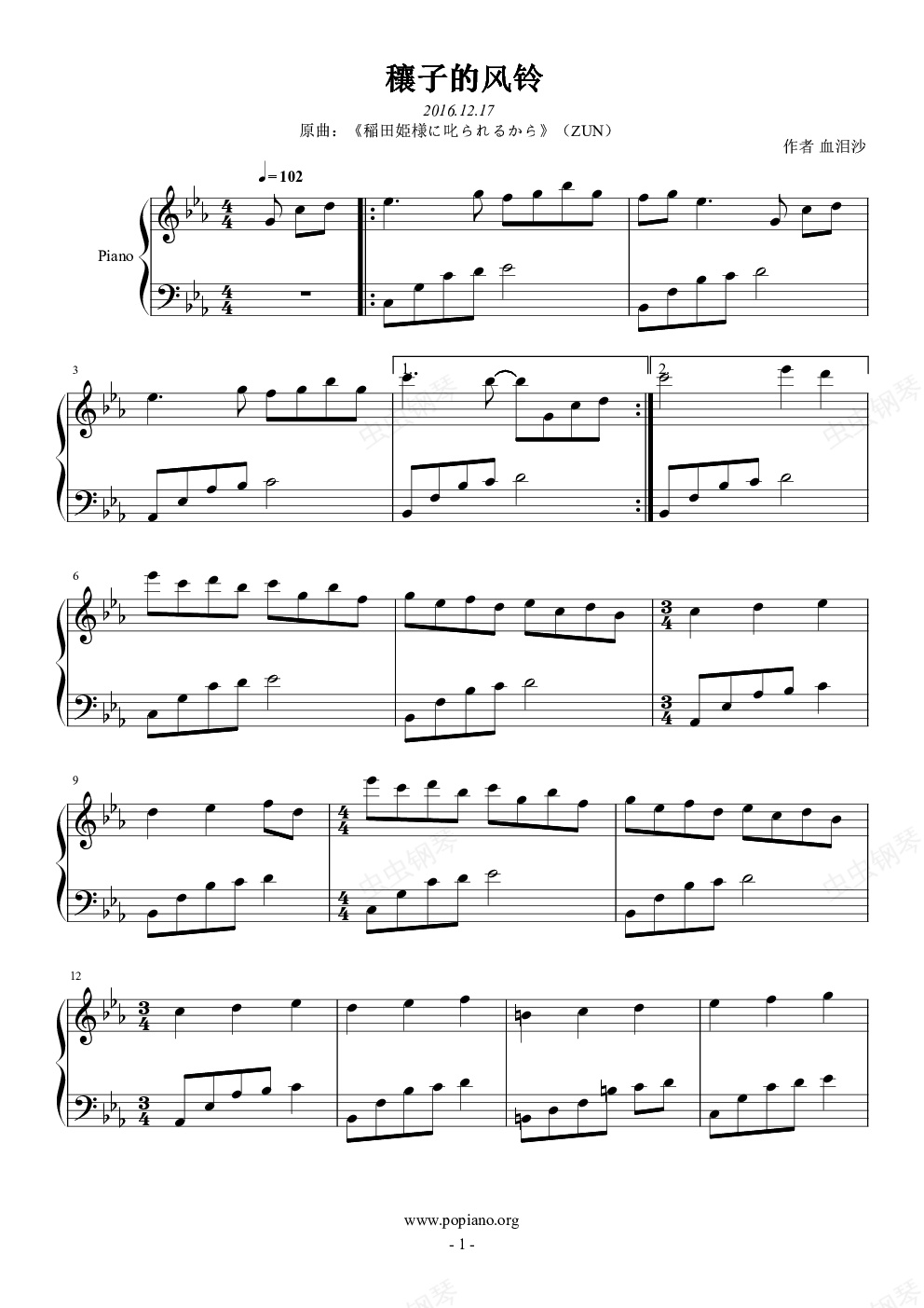 钢琴谱:【东方】穰子的风铃