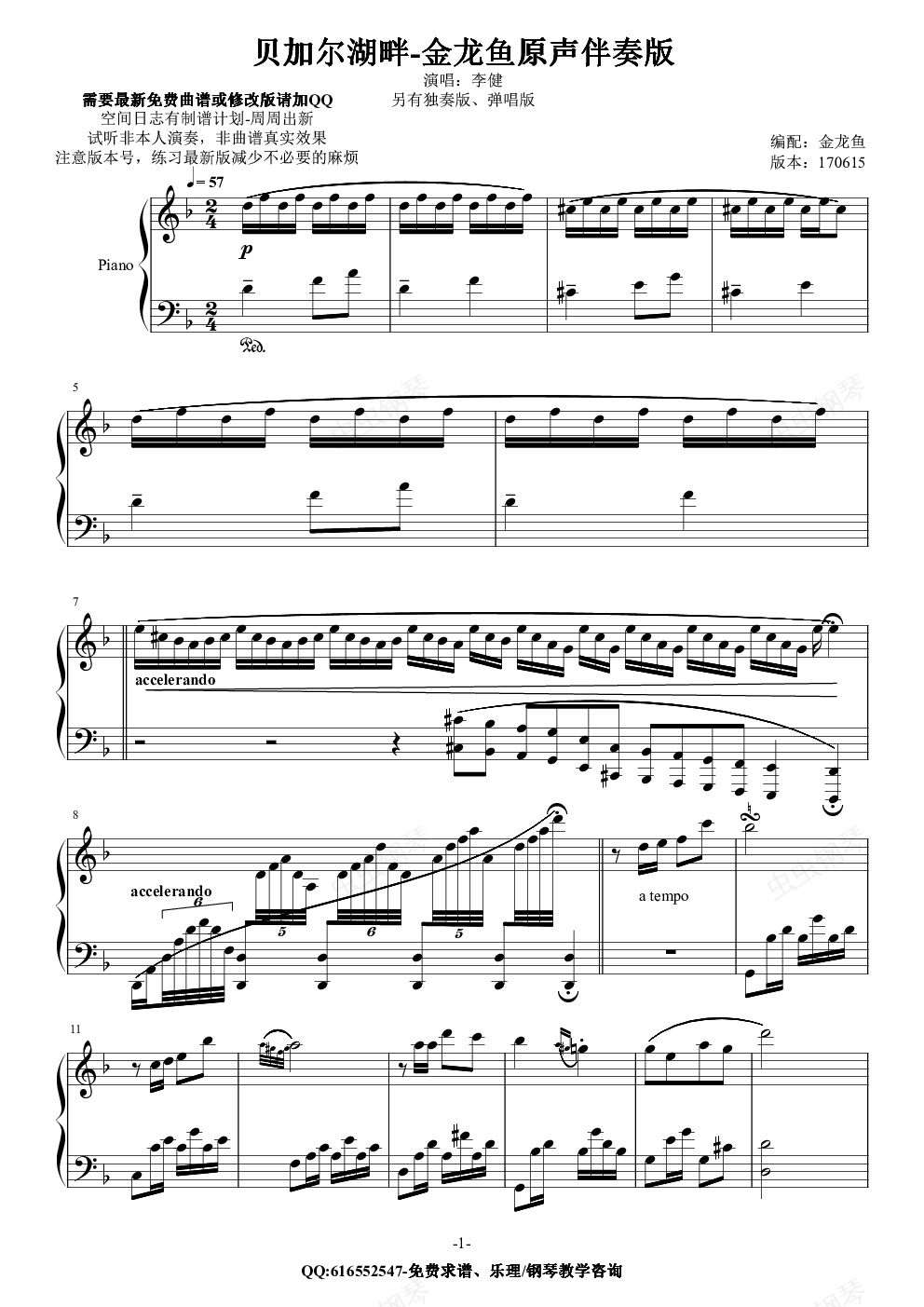 钢琴谱:贝加尔湖畔-金龙鱼原声伴奏版170616