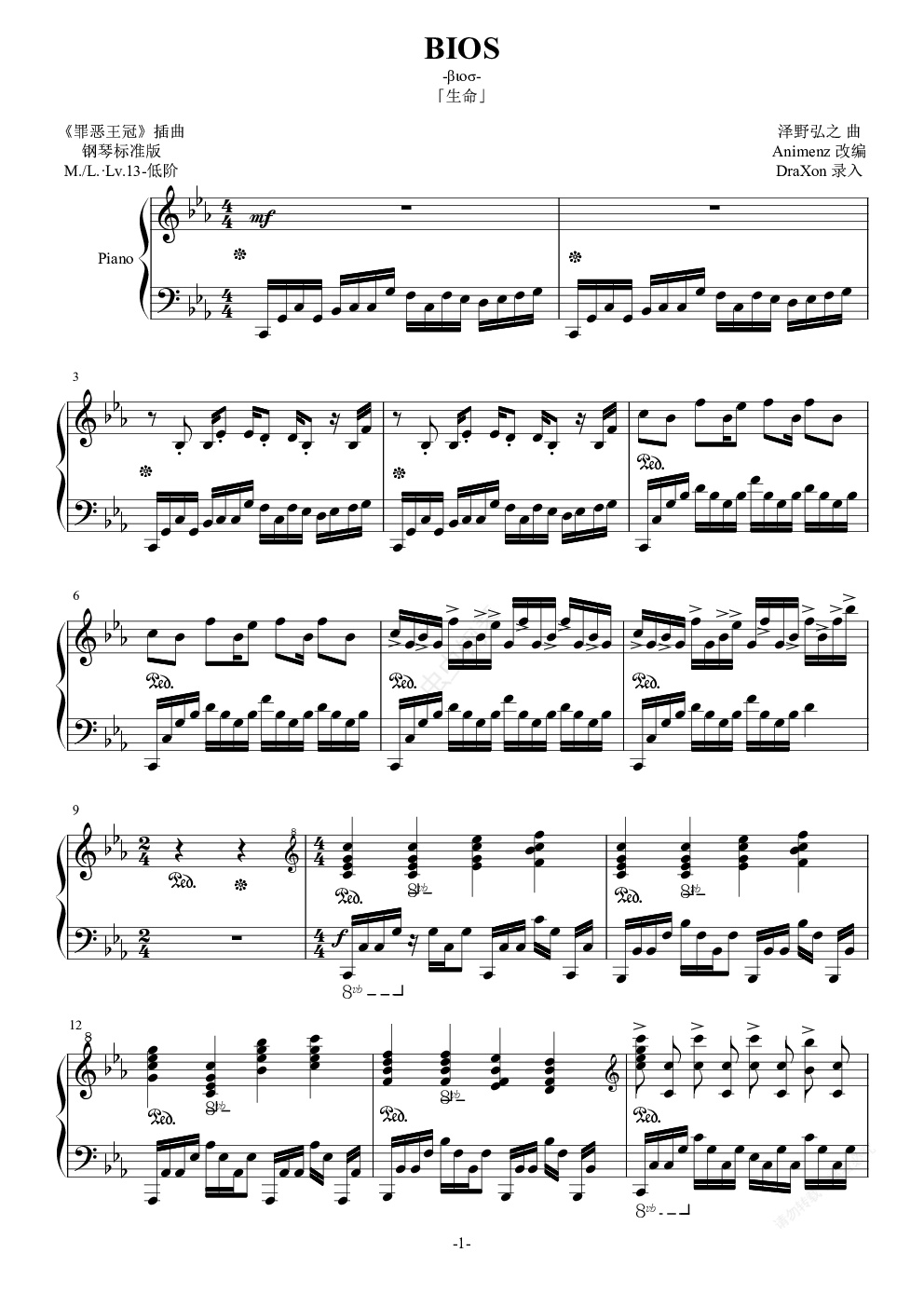 钢琴谱:BIOS(罪恶王冠插曲,完全版 by DraXon)