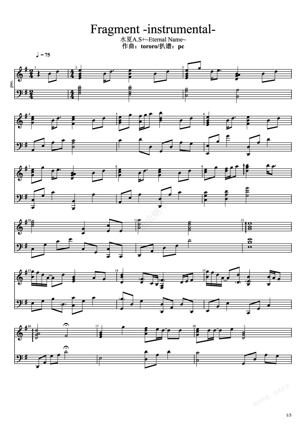 钢琴谱:Fragment -instrumental-(水夏A.S+~Eternal Name~*ED*Element Garden*galgame bgm)