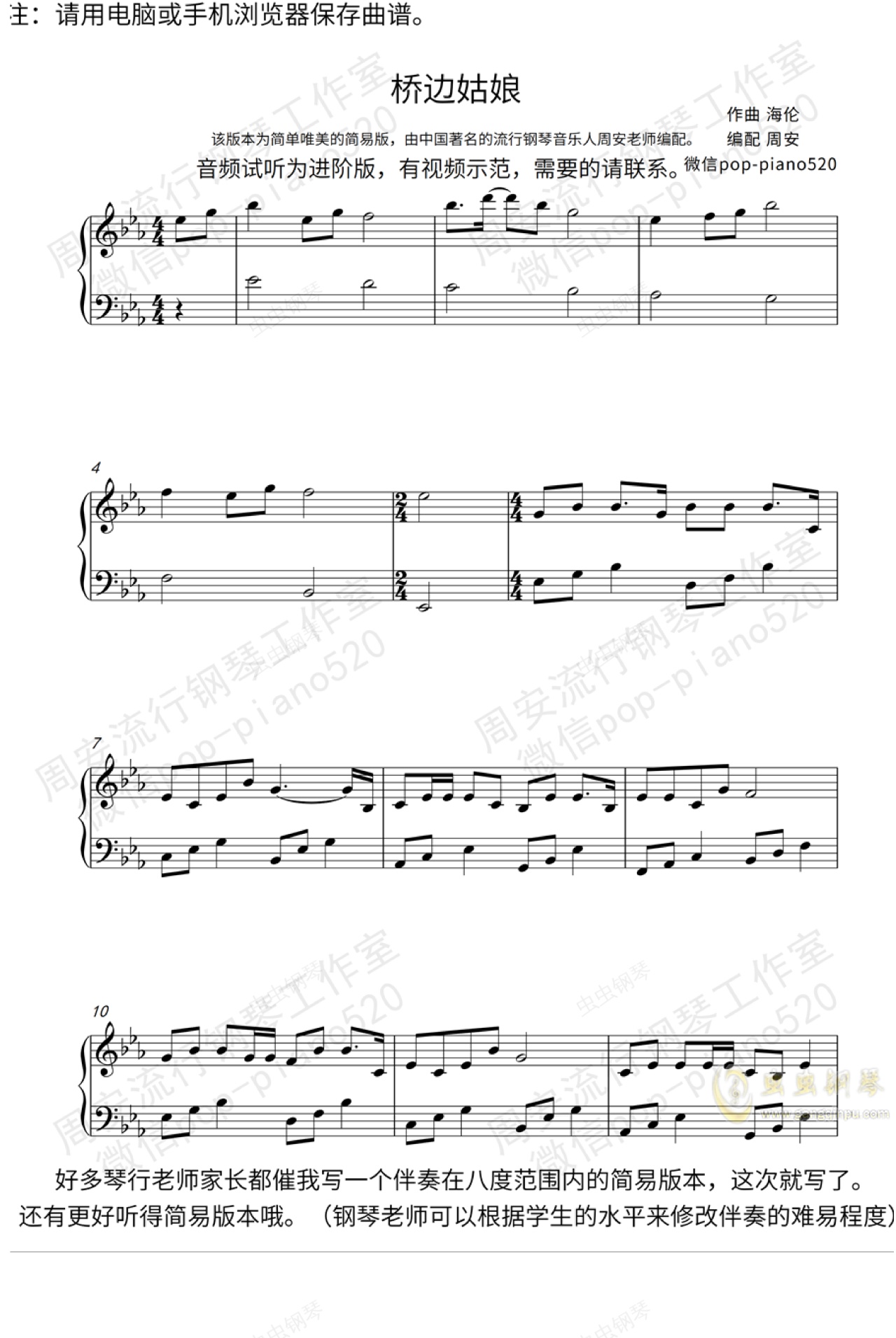 钢琴谱:《桥边姑娘》唯美钢琴版(周安老师)