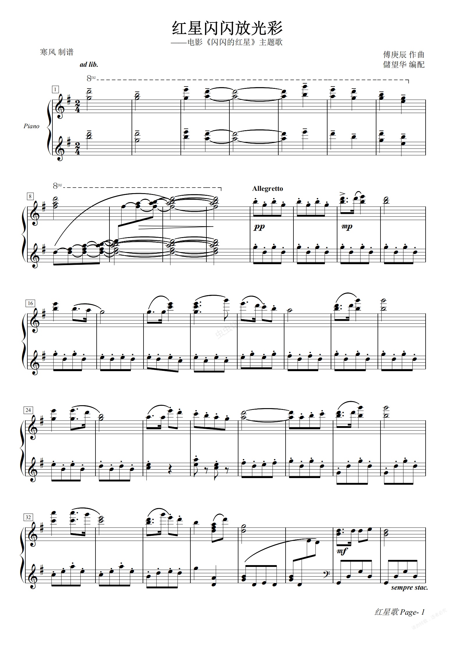 钢琴谱:红星歌-电影《闪闪的红星》主题歌