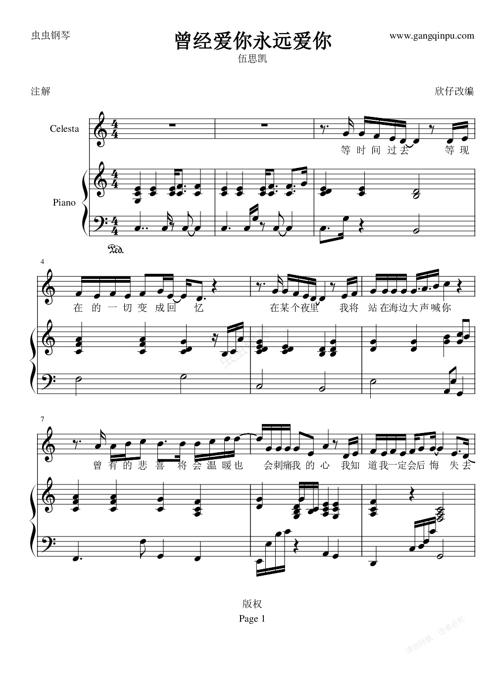 钢琴谱:曾经爱你永远爱你