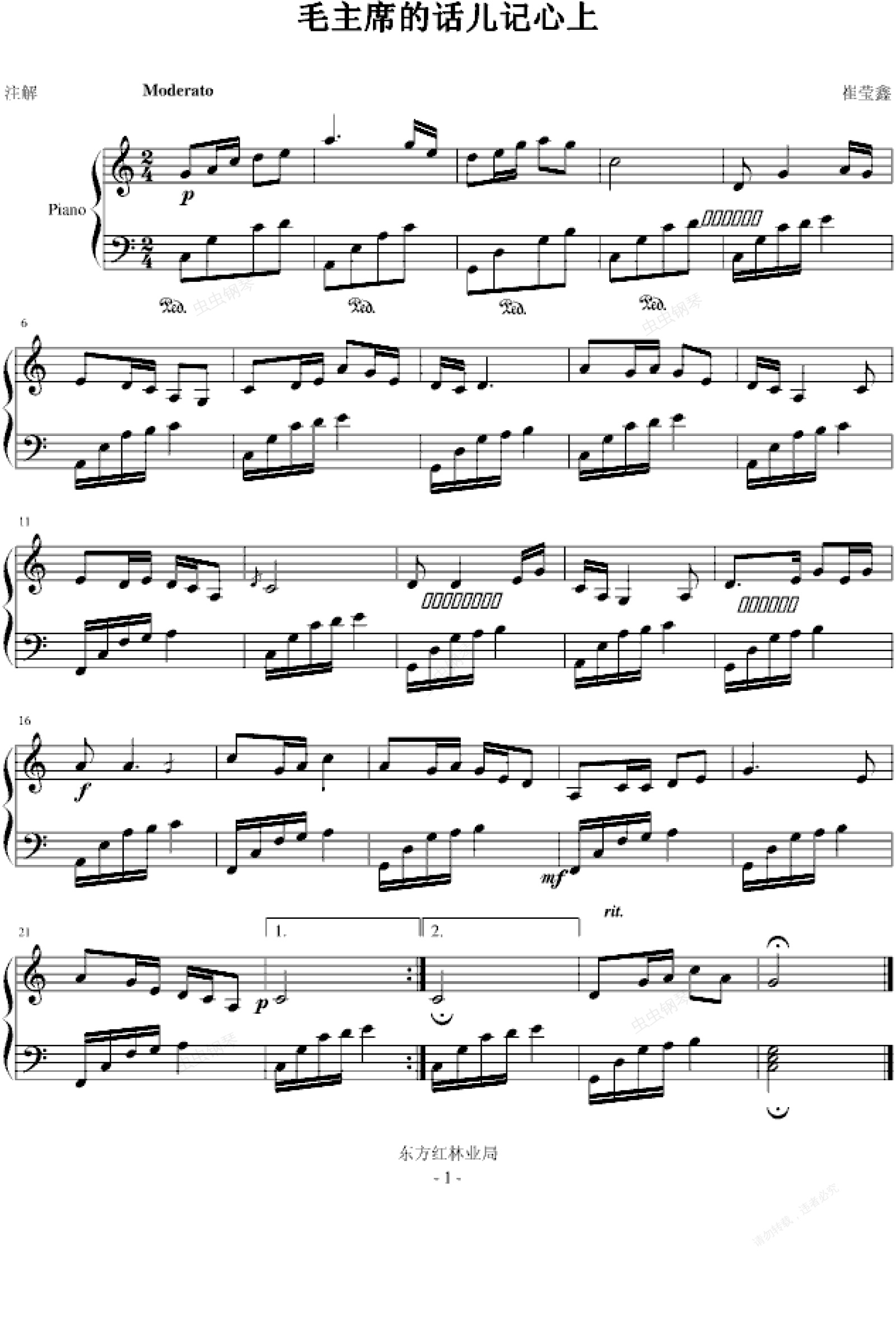 钢琴谱:毛主席的话儿记心上