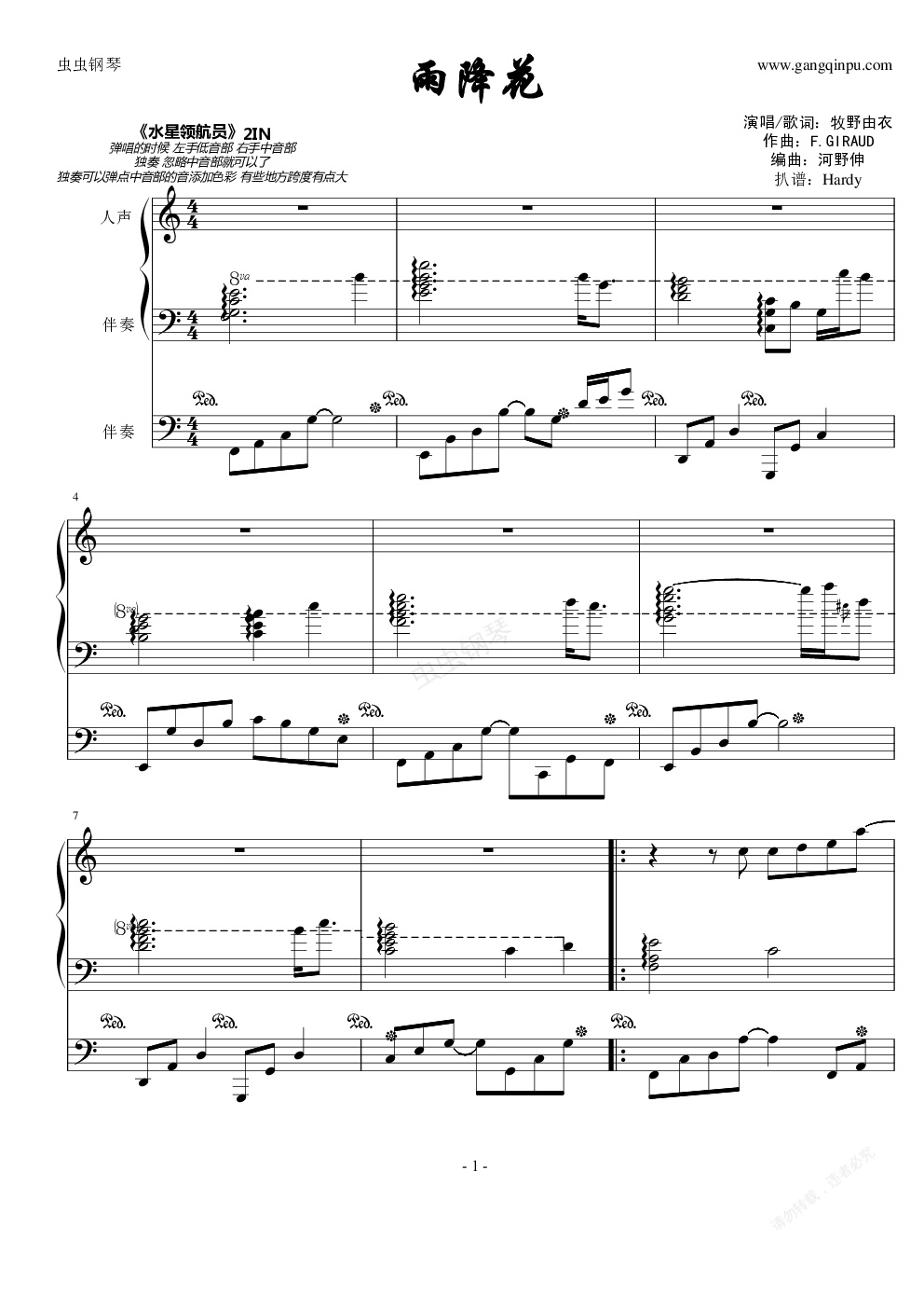 钢琴谱:《水星领航员》雨降花(ARIAAmefuri Hana)
