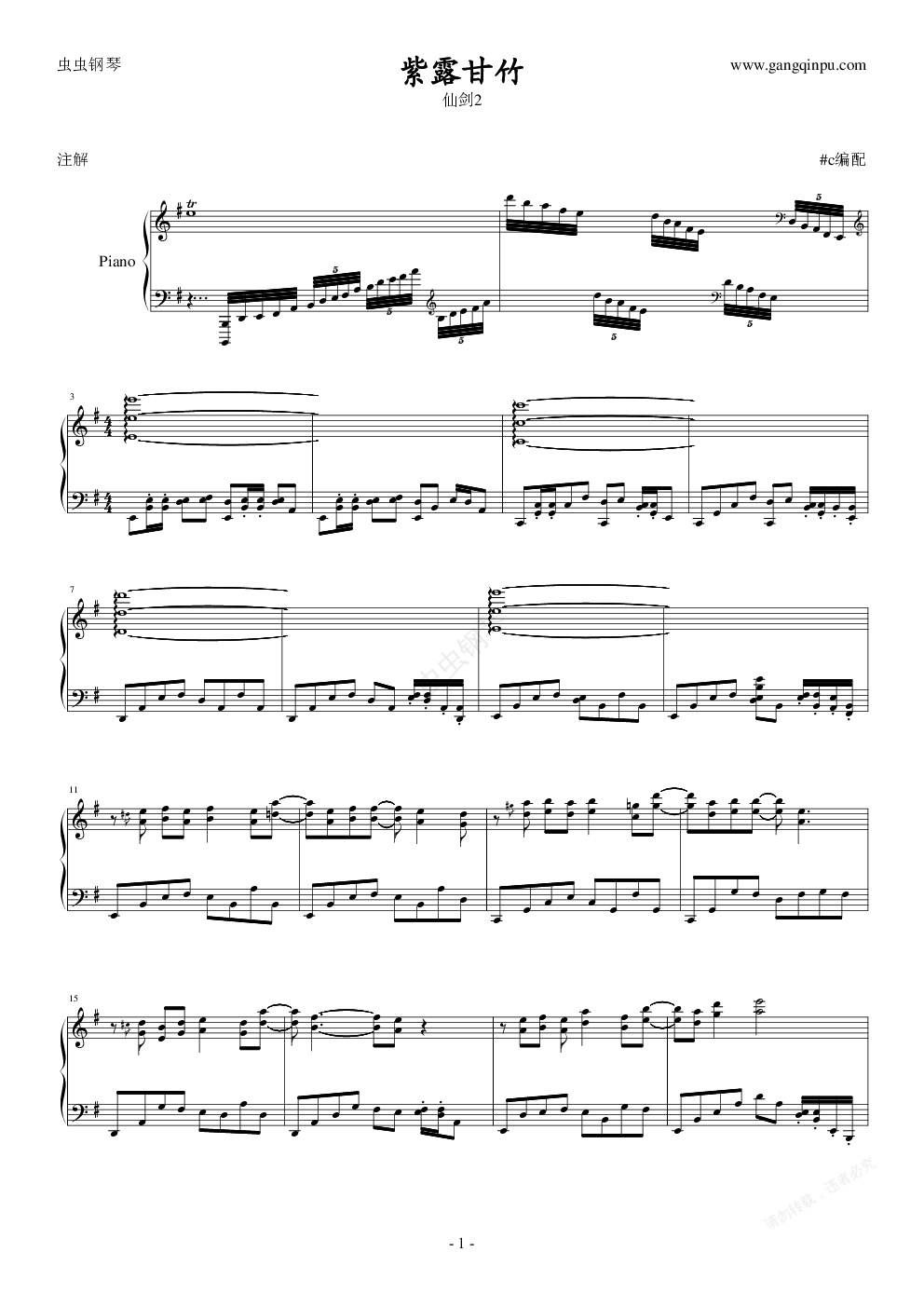 仙剑2的一首场景配乐,尽管作为仙剑系列在评价上不如其余作品,不过这部作品的音乐可以算是系列中最优秀的,尤其是这首《紫露甘竹》,作为场景配乐的空灵悠扬将相对应的紫露竹林的神秘鬼魅气氛渲染到极致,其中和民族五声音阶下动机变奏的点缀其中更是妙笔,略显小气婉转的音响特点恰与唯心主义下自我意识的膨胀不谋而合,很大程度上加强了“仙”这一听觉的感受,钢琴自然难以模仿女声以及三弦的效果,不过乐曲中用了其他的方式表现弯音的特点,曲子演奏难度不大,不过双手搭配可能需要下点功夫