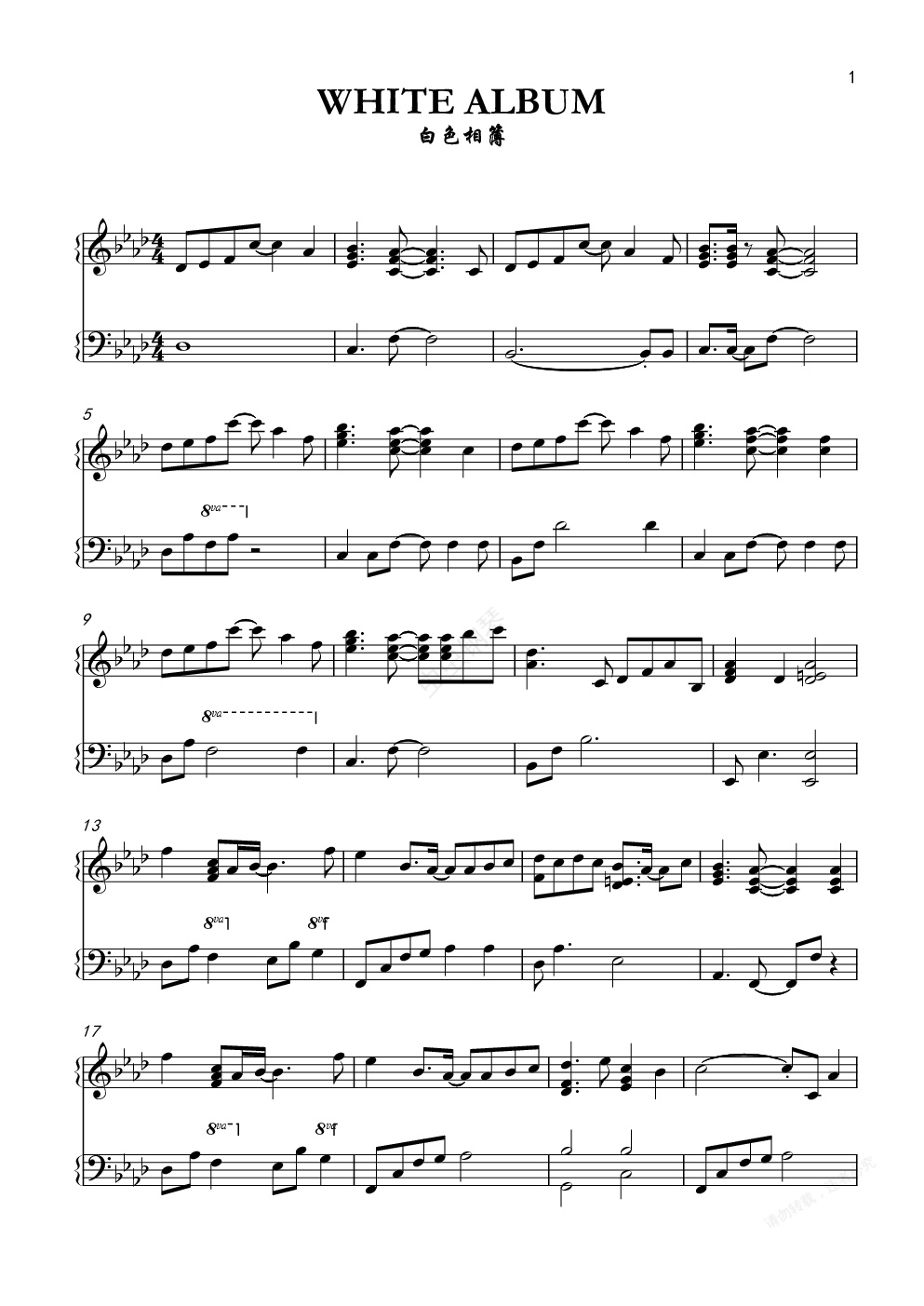 这个谱子本来是网友用GP5写的,打开后发现不太适合钢琴谱习惯(可能是我用不来GP5)。我用重稍微修改了下,变成五线谱,过高的音用高八度表示,有些小地方的错误改掉,其余的保持了原貌。非常感谢所做的贡献。个人感觉此版本比虫钢另一个White Album好些,所以改完后搬到这里。但是难度可能要高一些,新手可以适当地自己简化下。 老手请自行脑补自己是冬马和纱就可以了。