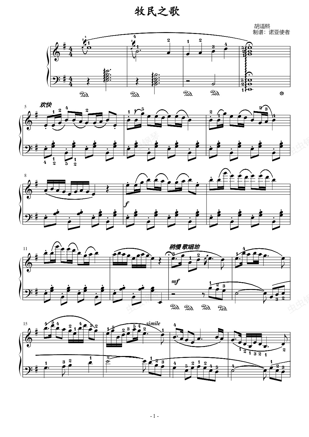 第二段是乐曲中的抒情部分,速度稍慢,通过两手奏不同的旋律,把牧民们你唱我和,互相对唱的情景表现得生动感人,演奏时注意双手旋律的歌唱性,注意各声部的分句。