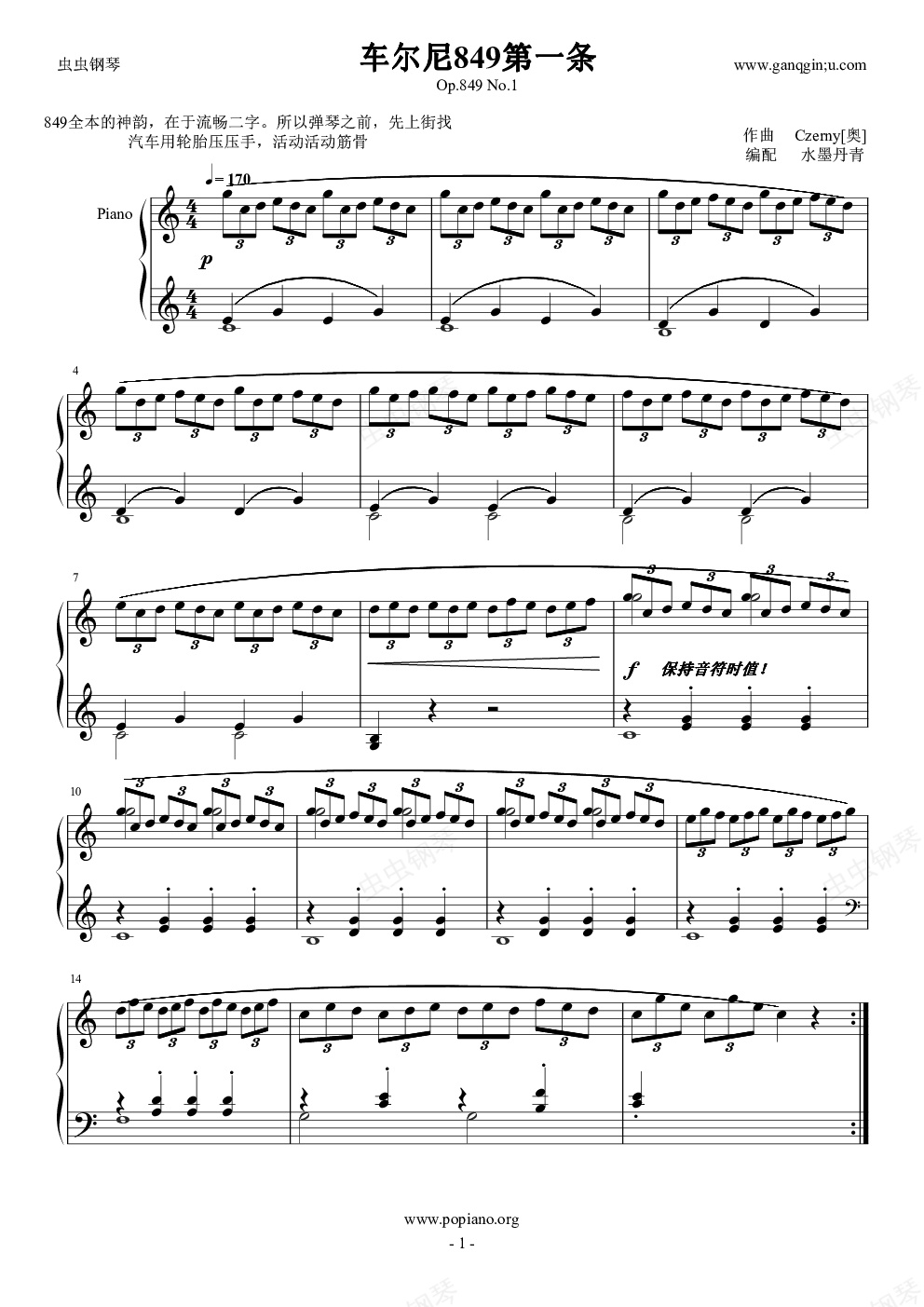 这首曲子用于练习,也是849开头的第一首。主要是右手,初步训练手指的灵活度,多注意指法(LZ太懒》==《就不标了)另外,为了方便,这首曲子在你弹熟了的时候,可以向上移半音,再弹一遍。很简单的曲子,初学者大概3天*2小时就可以搞定。当然,仅供初学者参考!又及,那个活动筋骨的方法,胆子大的可以试试,哈哈!踏板可以不踩,740之前我觉得几乎用不上踏板。上次的版本,粗心错了一个反复记号!!!抱歉!!!这次已经改正!!