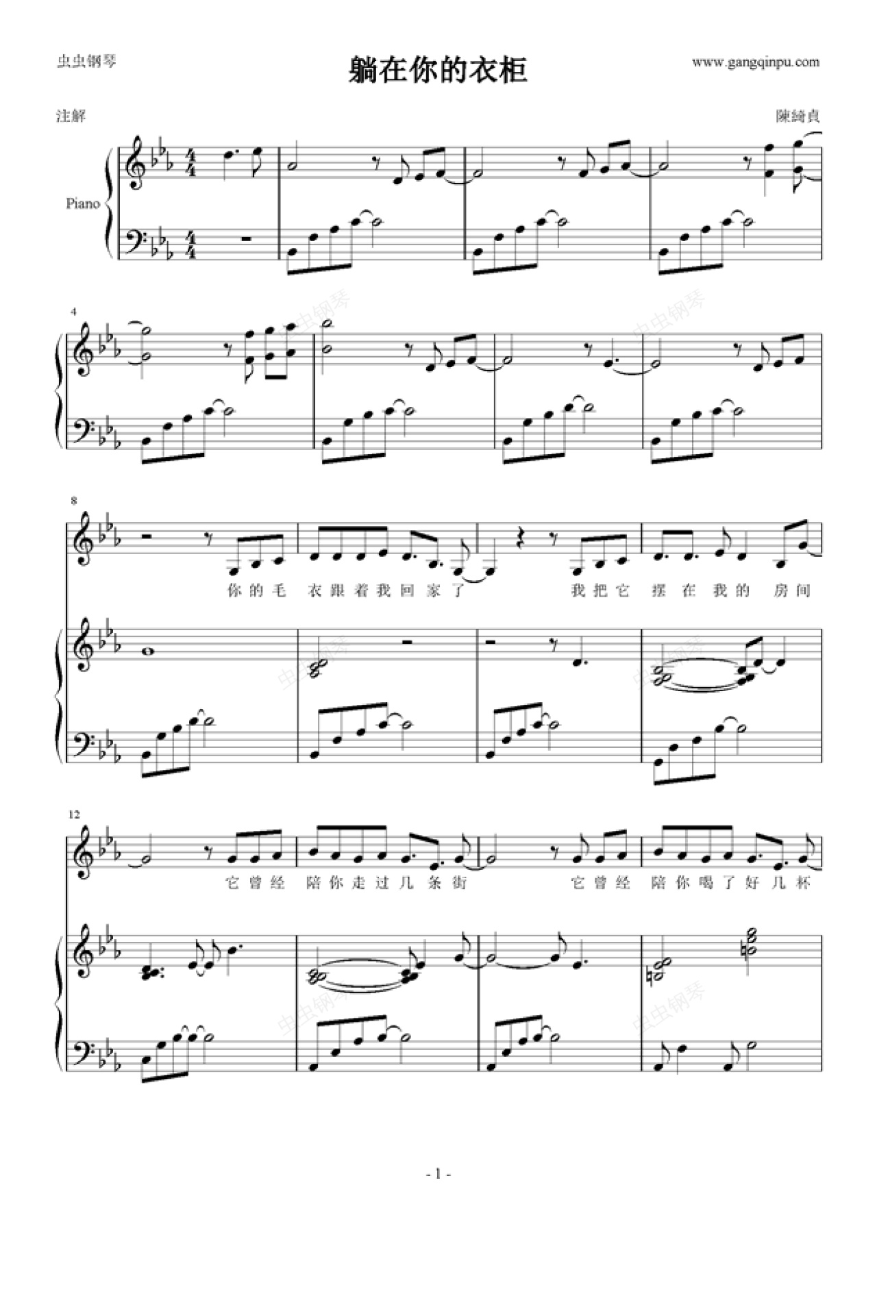 钢琴谱:陈绮贞-躺在你的衣柜(钢琴弹唱)
