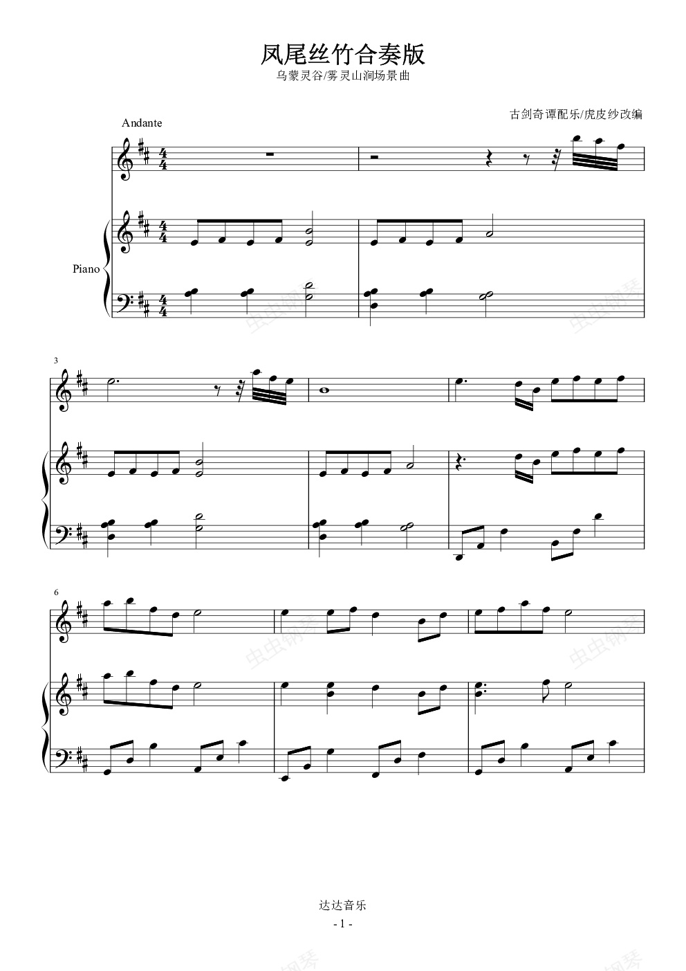 钢琴谱:古剑奇谭 凤尾丝竹合奏版D调