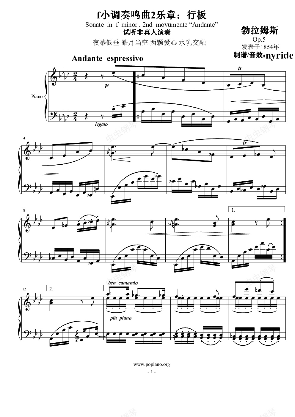 钢琴谱:勃拉姆斯《行板》