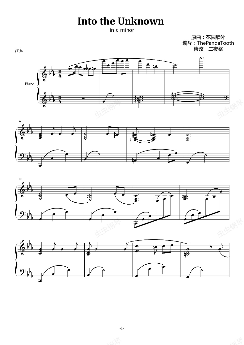 钢琴谱:【花园墙外】Into the unknow c小调版