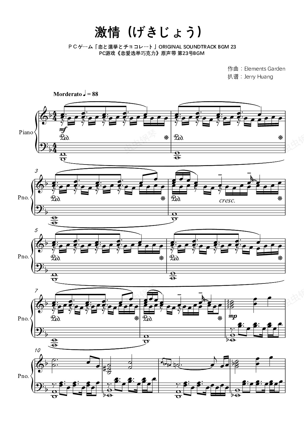 实在抱歉,上传了之后才发现原谱有很多错误,试听也有问题,所以这次上传了2.0版本,也希望审核的人螚多多谅解。 这首BGM是PC游戏《恋爱、选举、巧克力》的第23号BGM,一般在男主和选择的女生KISS时、揭露生世时以及紧急情况出现之后使用,也是本人印象最为深刻的BGM之一。 本人扒谱能力有限,希望各位能多多提出意见,同时也希望能有大师能扒出本游戏以及同名TV动画的OP、ED和其他BGM。 [IMG]/pu/2016/10/8/__7406__[/IMG]