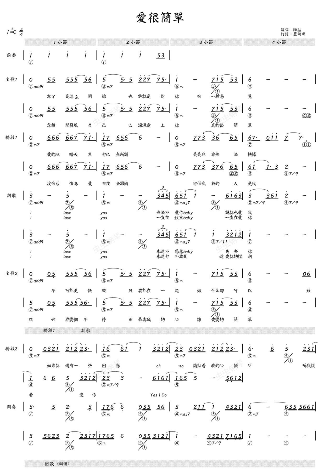 钢琴谱:《爱很简单》简谱 和弦谱 简和谱