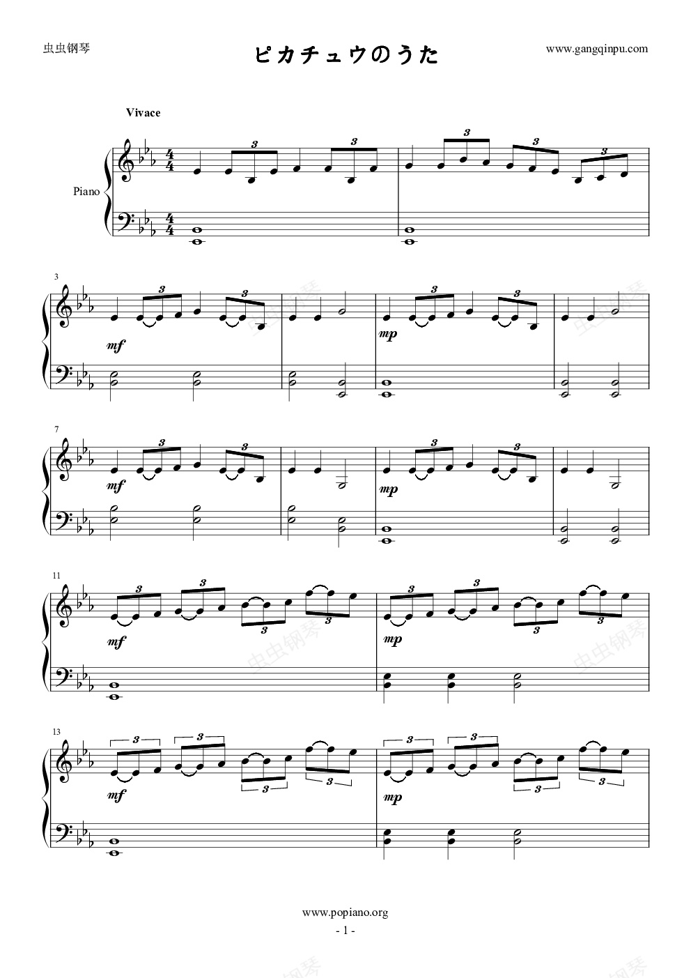 钢琴谱:皮卡丘之歌-神奇宝贝XY&Z角色歌