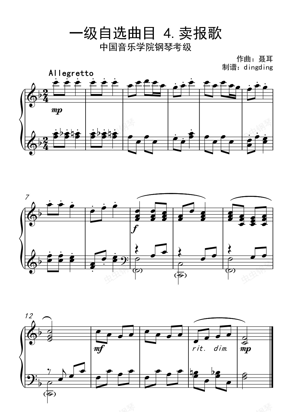 钢琴谱:中国音乐学院考级一级自选曲目 4.卖报歌